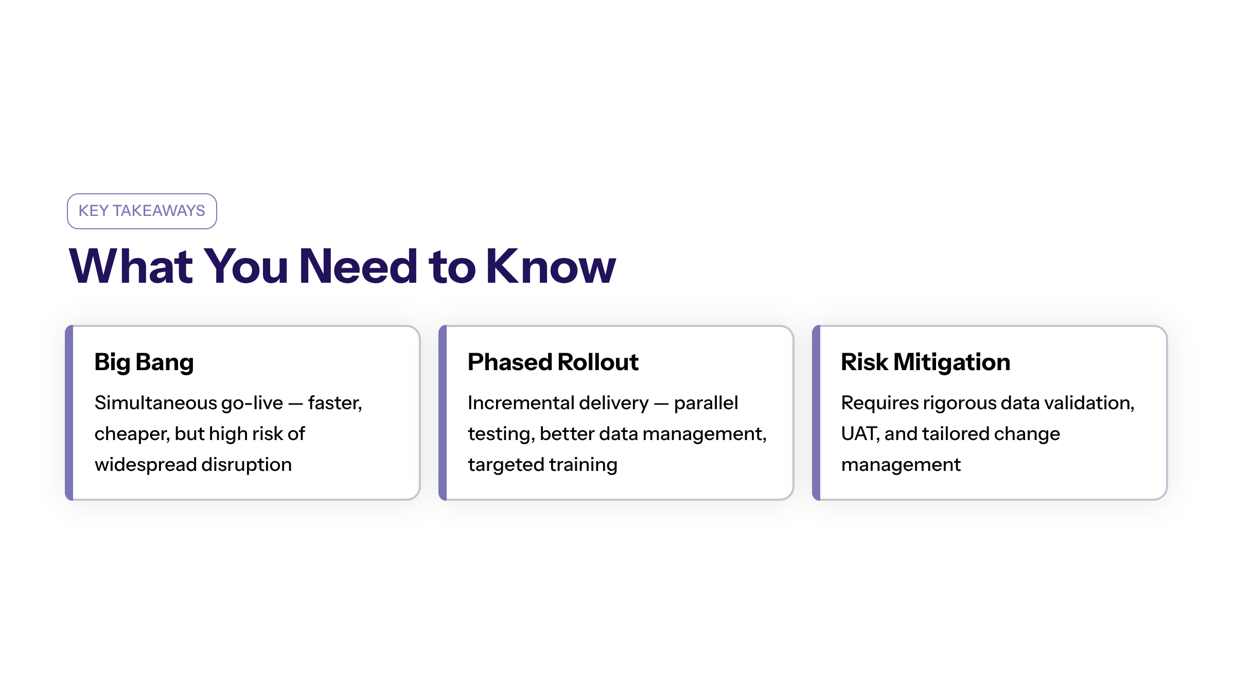 The decision between big bang and phased rollout approaches is not merely technical but strategic. Executives must prioritize risk mitigation, data integrity, and user readiness to ensure a successful system rollout that supports business continuity and long-term operational excellence.