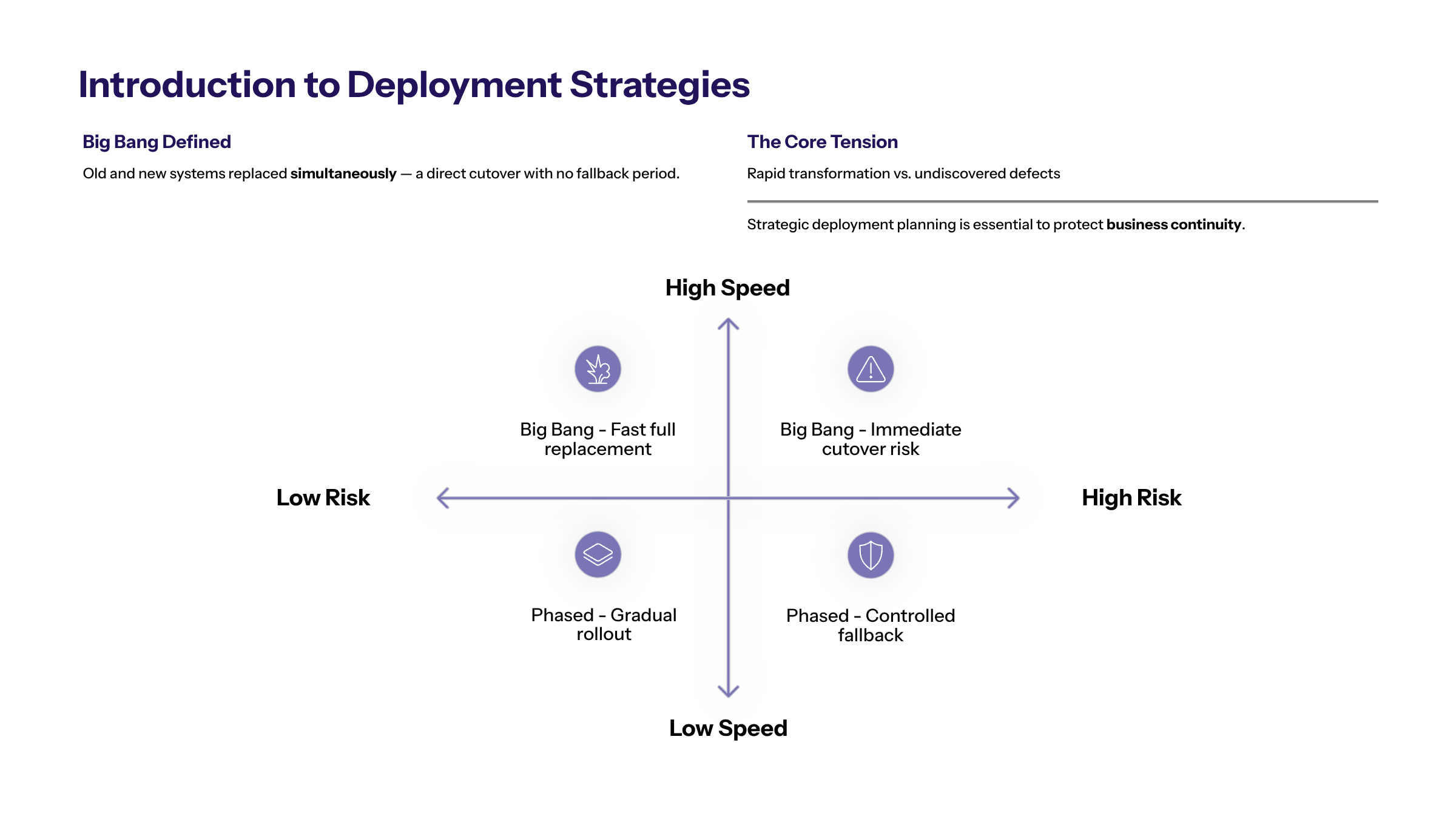 This is known as a big bang deployment—a deployment strategy where the entire system is replaced at once, which increases the risk of undiscovered defects and human error compared to more gradual approaches. Conversely, a phased approach introduces new features or modules in controlled stages, maintaining dual systems during a transitional period to reduce risk.