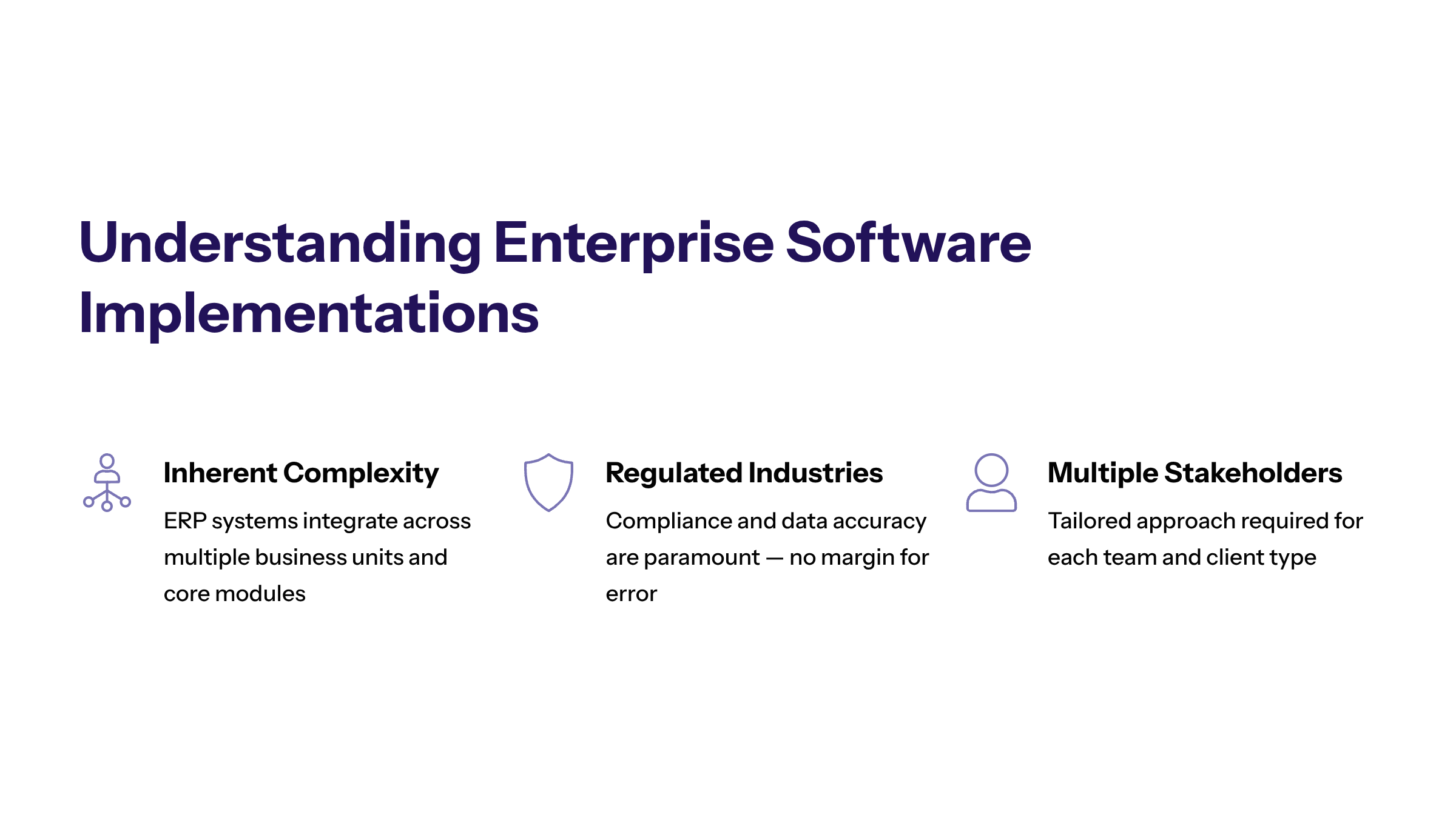 Enterprise software, particularly ERP implementations, are inherently complex due to their integration with multiple business units and critical core modules.