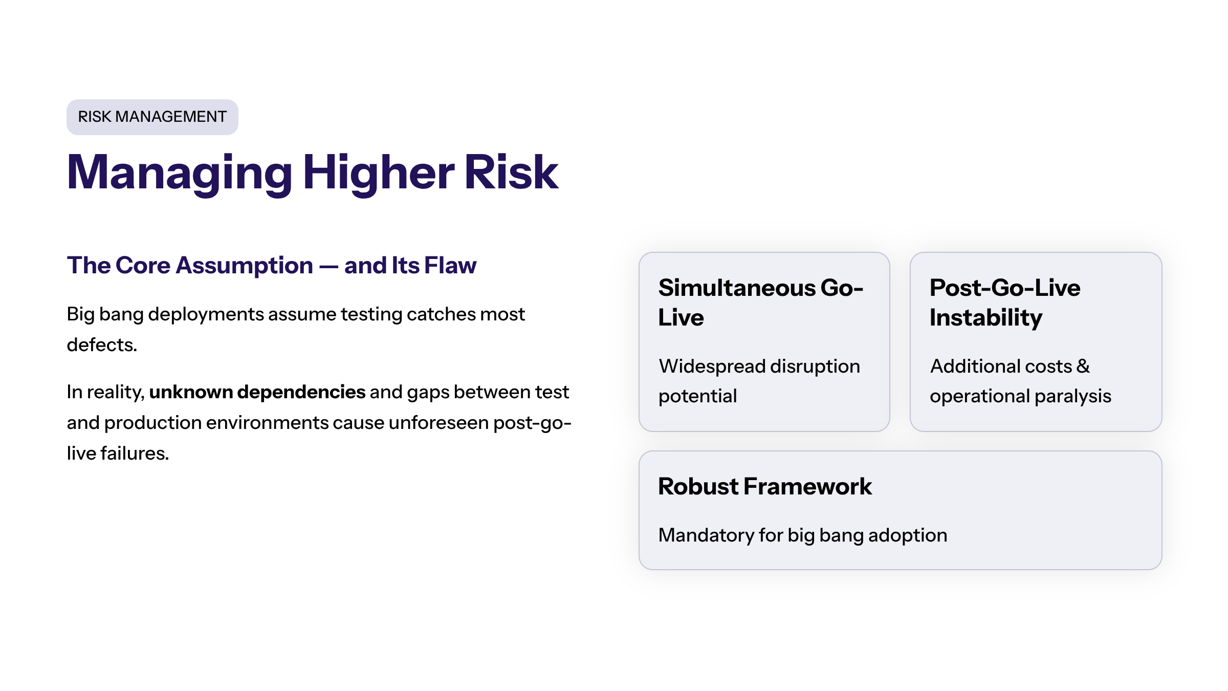 System Instability | Unanticipated defects or incompatibilities due to simultaneous deployment | Downtime, customer dissatisfaction, delayed ROI | Extensive user acceptance testing, rollback plans |