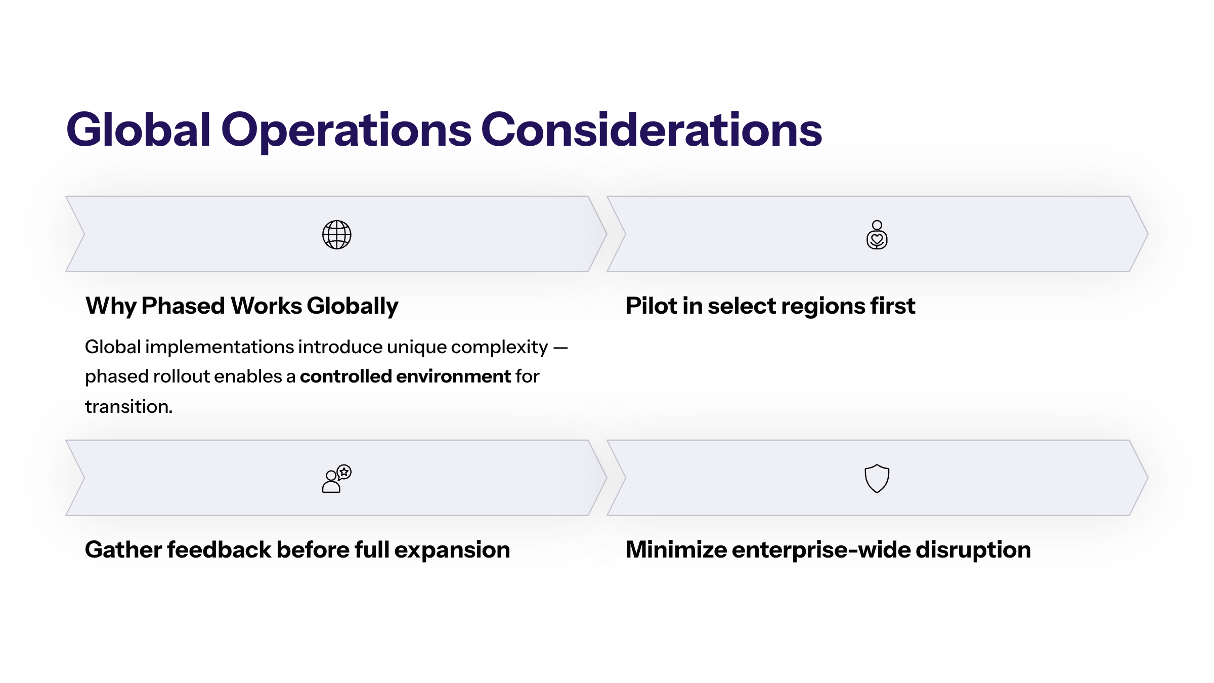 Effective change management is essential in both approaches, but especially critical in global rollouts, where communication, training, and support must be tailored to diverse teams and time zones. By leveraging a phased implementation, organizations can ensure a smoother transition, reduce the risk of operational paralysis, and achieve a more successful system rollout on a global scale.