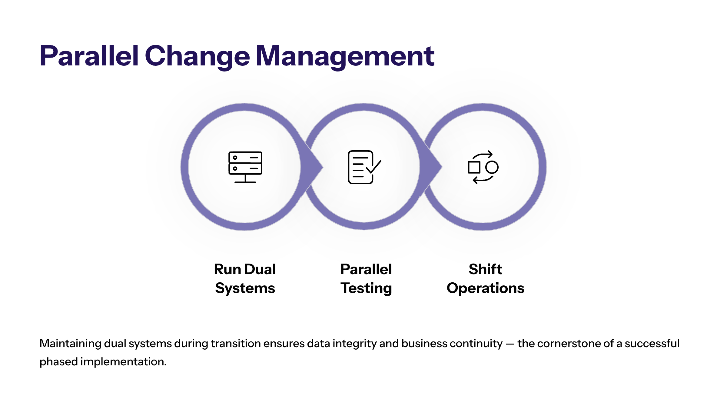 Effective change management during this period is essential, as it helps internal teams adapt to new workflows while still relying on familiar processes. Ultimately, parallel change management provides a safety net that supports a smoother, more reliable transition to the new system.