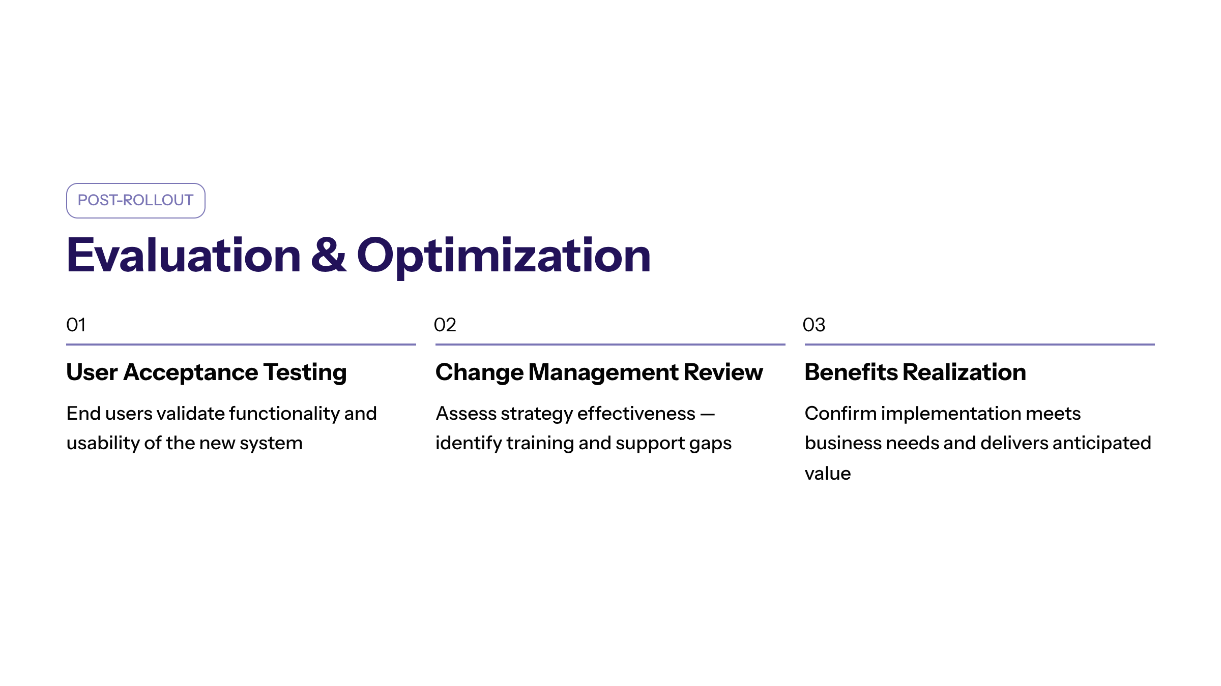 For big bang implementations, post-rollout evaluation is especially critical, as any issues arising from the simultaneous go live must be addressed promptly to avoid prolonged disruptions. In a phased implementation approach, each phase offers an opportunity for incremental evaluation and optimization, allowing the organization to refine processes and resolve challenges before proceeding to the next stage.