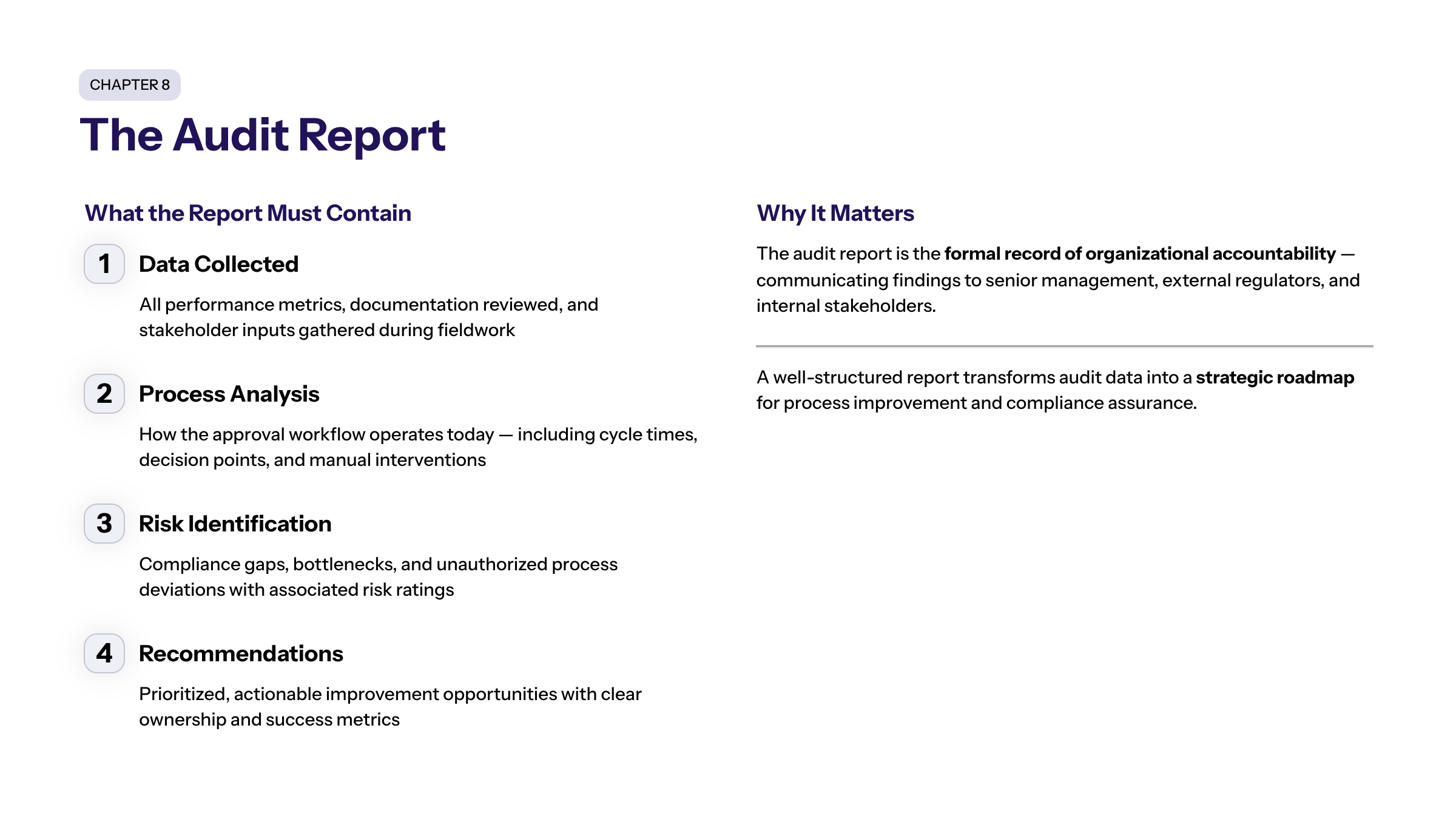 An essential deliverable of the approval process audit is the audit report. This comprehensive document consolidates all relevant information gathered during the audit, including data collected, analysis of how the process works, identified associated risks, and valuable insights derived from the evaluation. The audit report serves as a formal record that communicates audit findings, highlights opportunities for improvement, and provides clear recommendations for process improvement.
