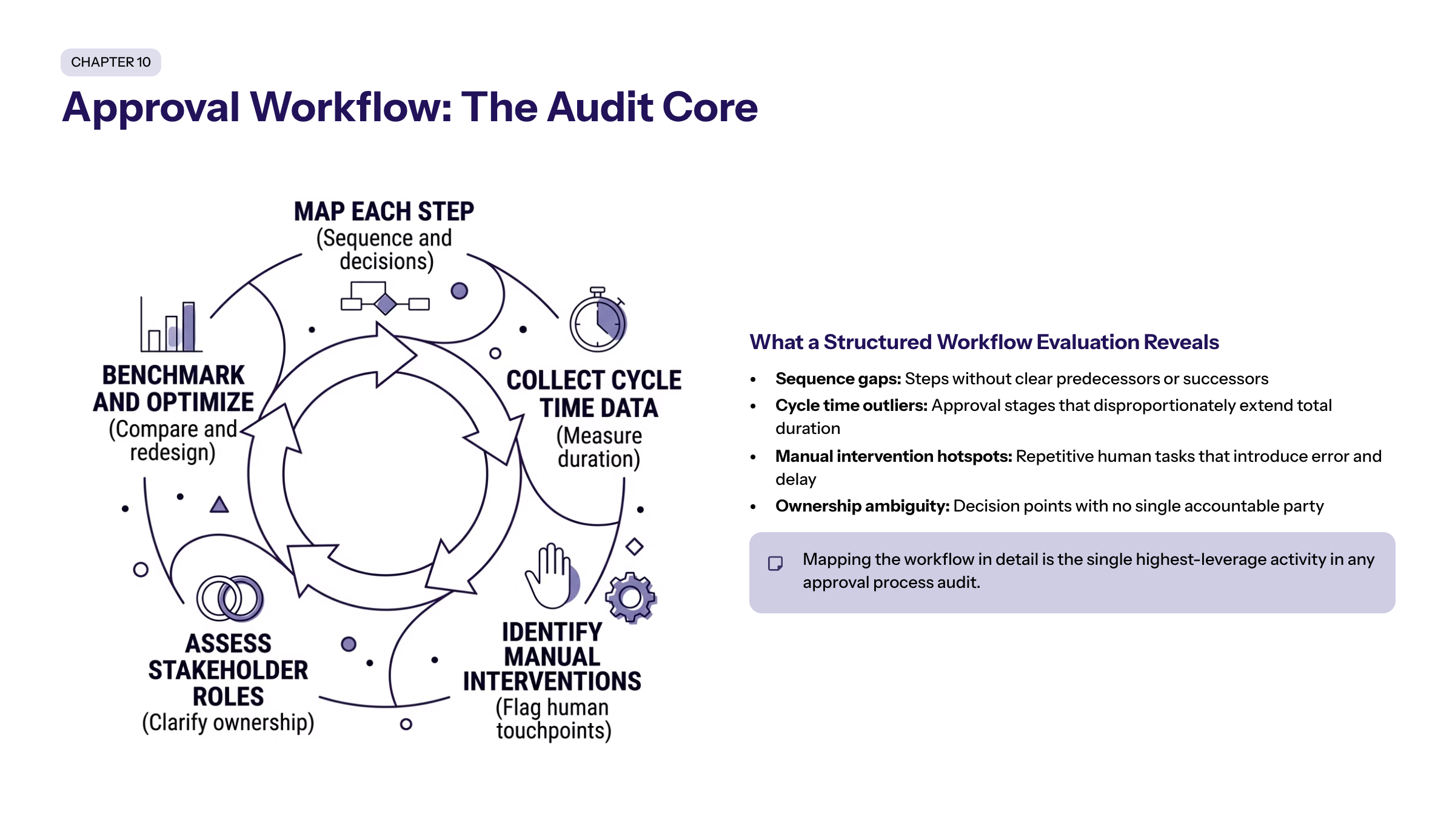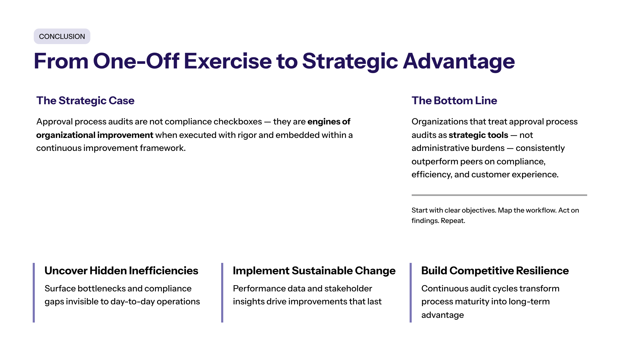 Optimizing the approval workflow focuses on streamlining operations, eliminating unnecessary steps, and fostering continuous improvement. Organizations should embed regular audit cycles into their governance frameworks to maintain alignment with evolving business goals and regulatory requirements. Regular business process audits enhance operational efficiency by uncovering delays and manual bottlenecks, which in turn improves compliance with service-level agreements and regulatory requirements.