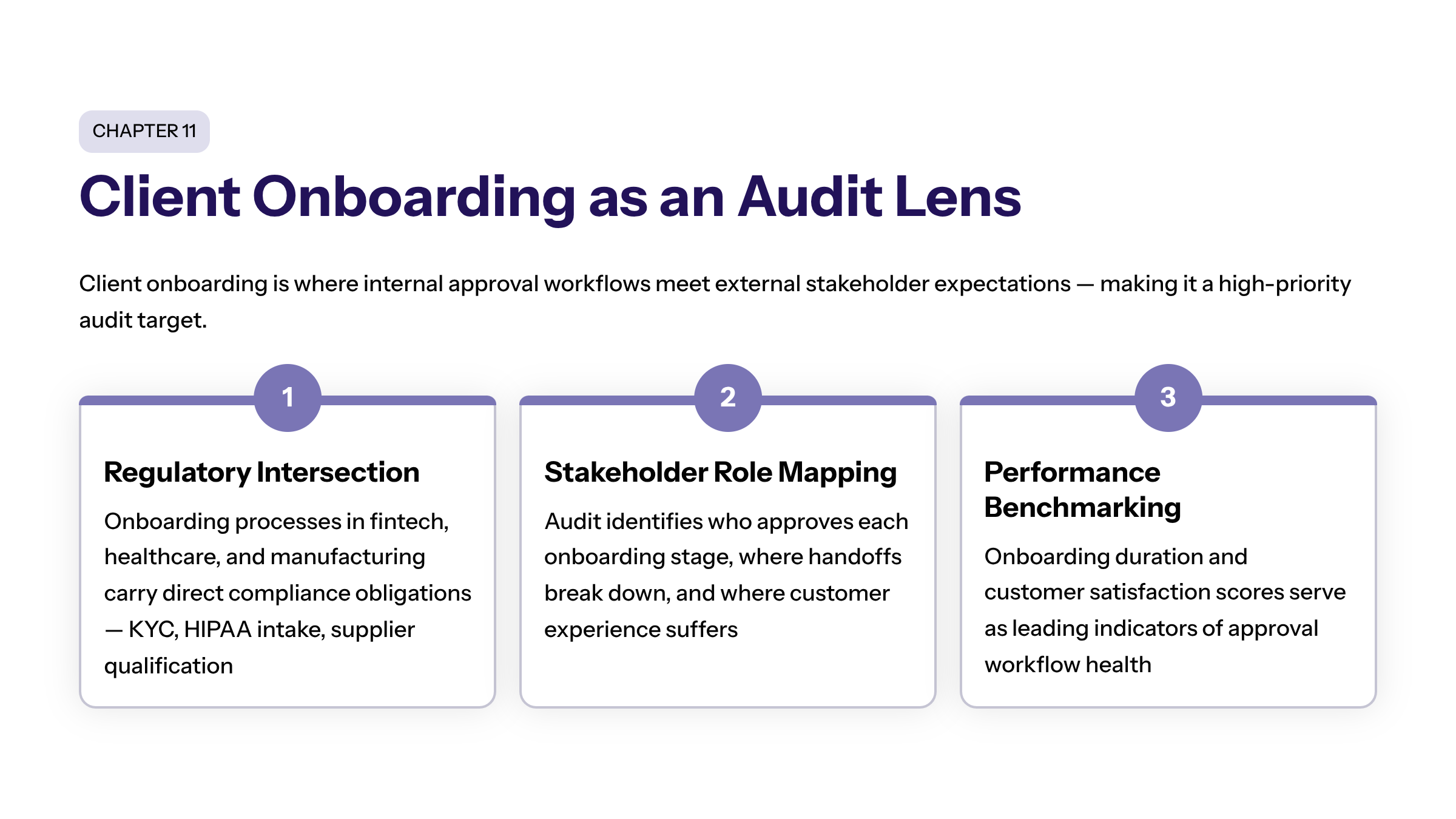 Client onboarding is a critical external process that often intersects with approval workflows, especially in industries such as fintech, healthcare, and manufacturing. Auditing client onboarding processes provides valuable insights into how organizations engage with external stakeholders and ensures that these interactions comply with regulatory requirements.