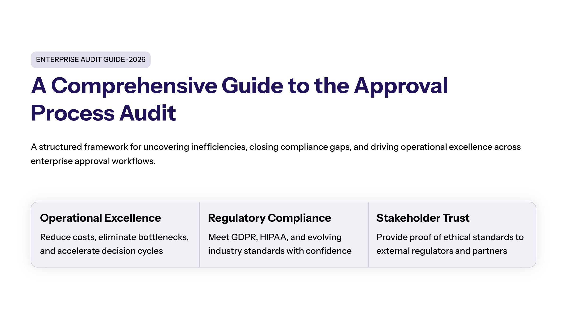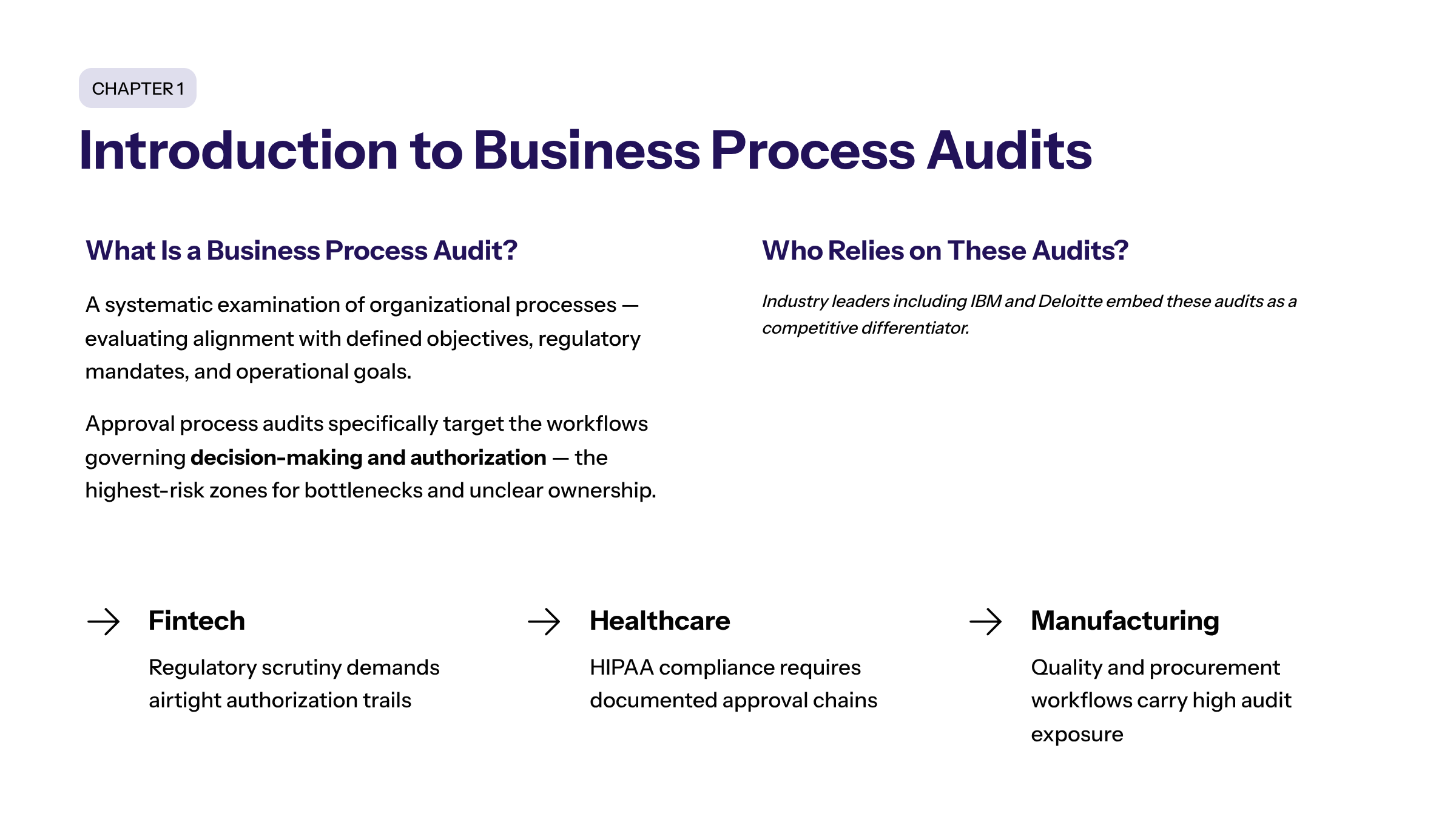 Business process audits represent a systematic examination of an organization's processes to evaluate how well they meet defined objectives, regulatory compliance, and operational goals. Specifically, an approval process audit focuses on the workflows that govern decision-making and authorization, which are often fraught with bottlenecks, unclear ownership, and manual interventions.