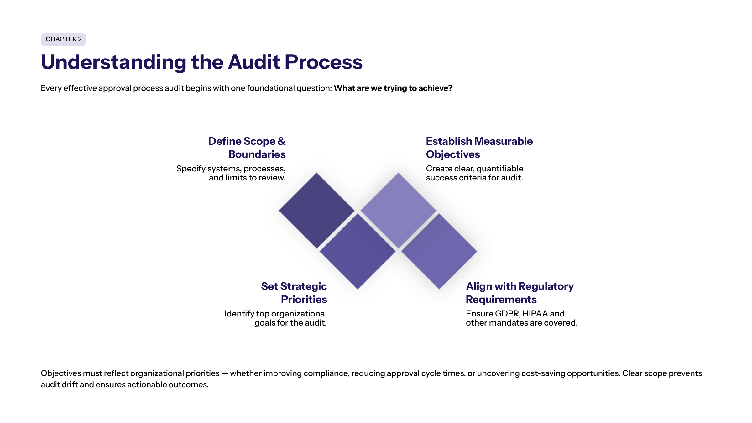 A foundational step in any approval process audit is establishing clear, measurable audit objectives. Defining the objective and scope is the first step in conducting a business process audit. These objectives should reflect the organization's strategic priorities, such as improving compliance with regulatory requirements like GDPR or HIPAA, identifying cost-saving opportunities, or enhancing customer experience through faster approval cycles.