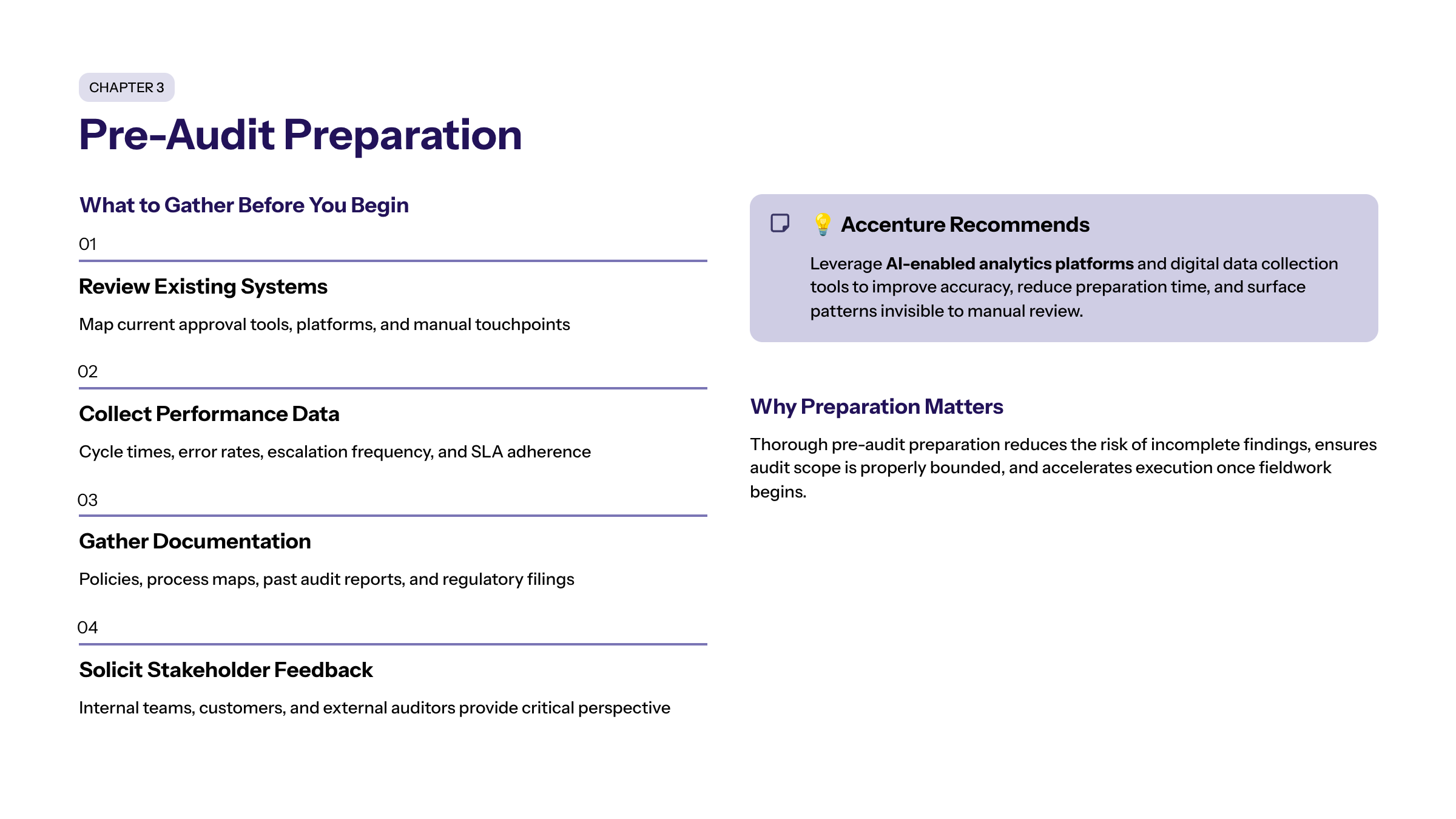 Organizations like Accenture recommend leveraging digital tools and AI-enabled analytics platforms to streamline data collection and enhance the accuracy of insights. Implementing a centralized electronic system can streamline document management and improve the efficiency of audits. Comprehensive preparation sets the stage for a focused and efficient audit process.