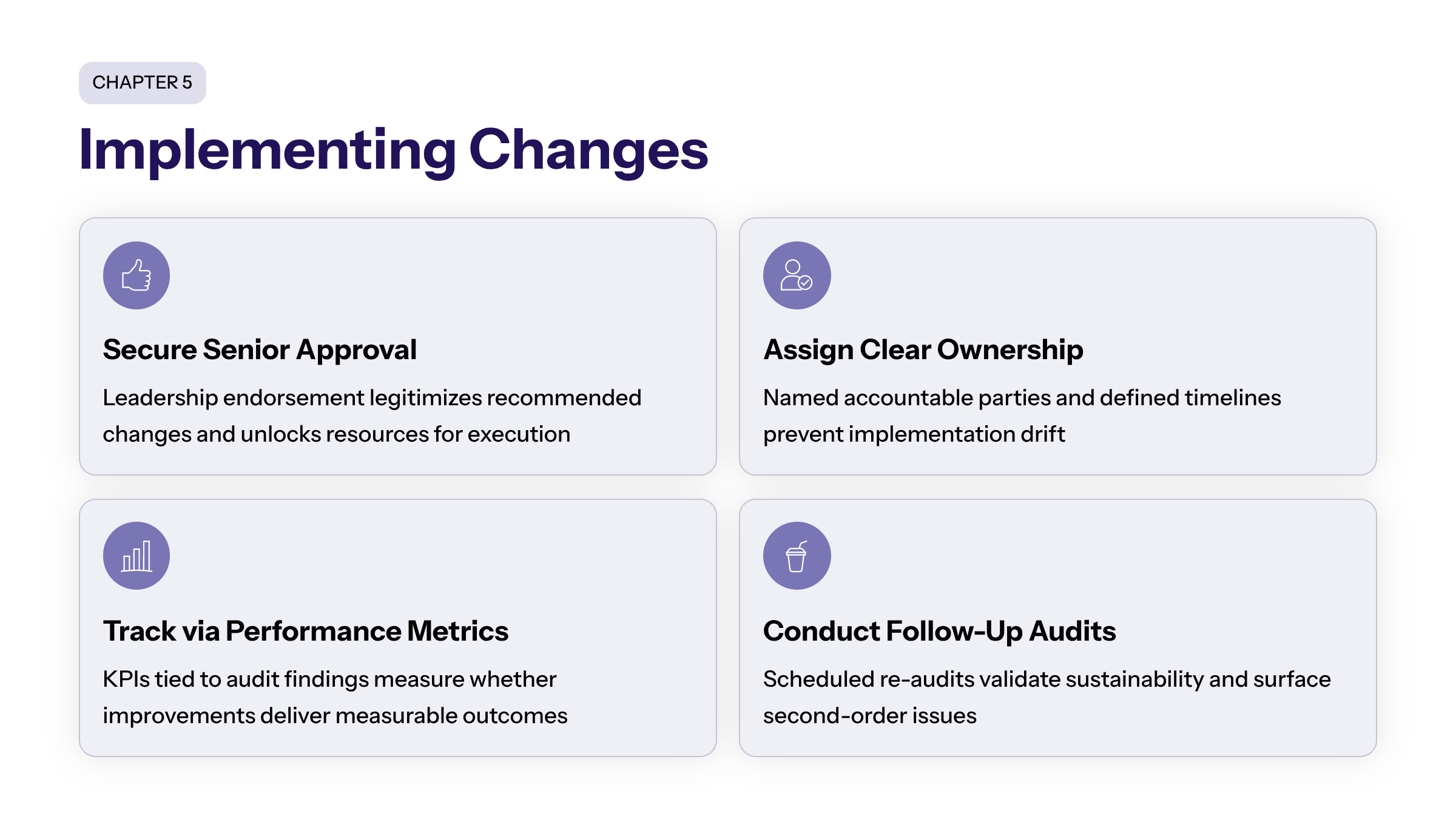 Senior management approval is vital for endorsing recommended changes. Assigning clear ownership and establishing timelines ensures accountability during implementation. Tracking progress through performance metrics and conducting follow-up audits helps measure effectiveness and sustainability.