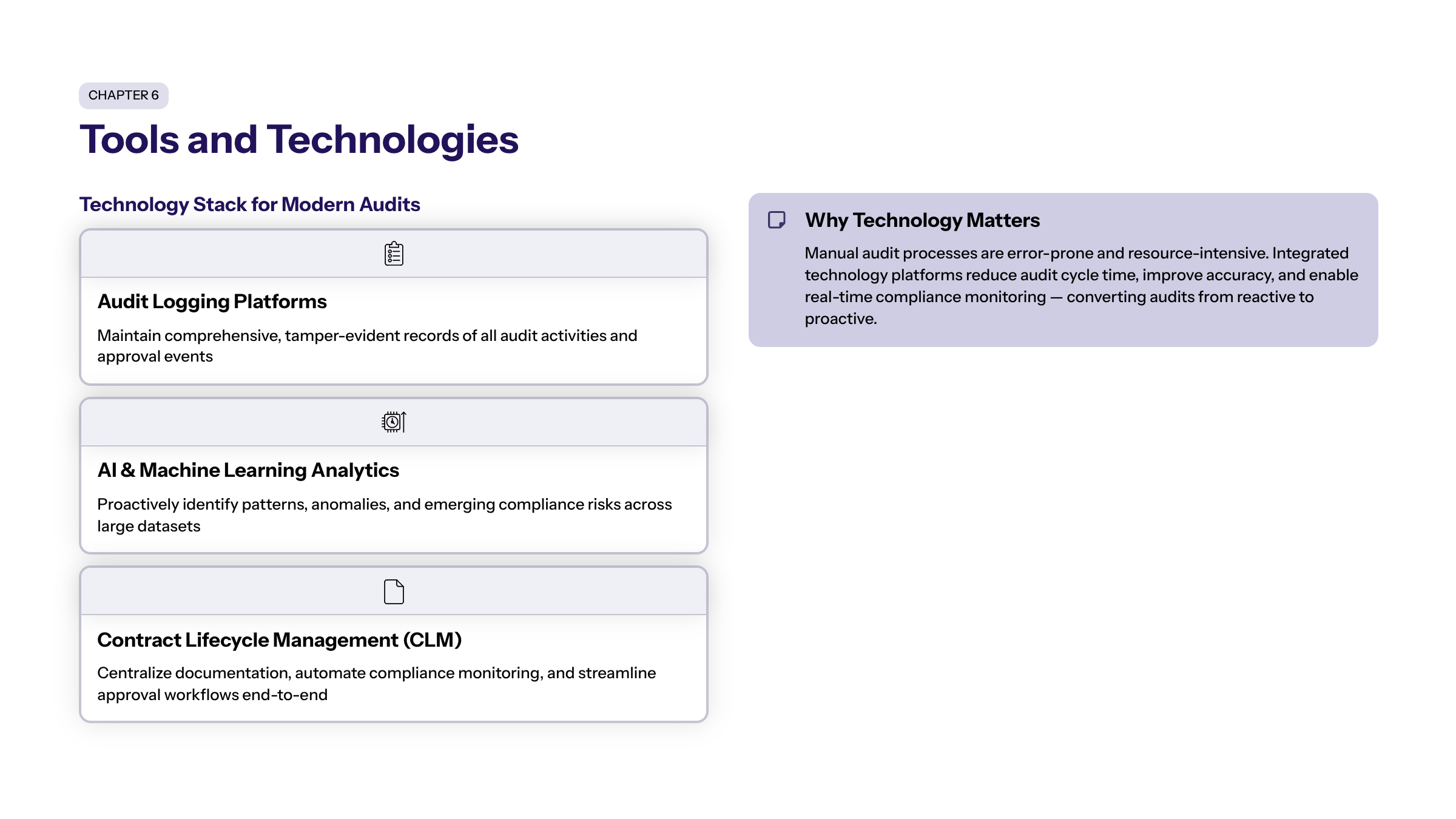 Technology tools like contract lifecycle management (CLM) platforms can centralize documentation and automate compliance monitoring, enhancing the auditing process. Automated systems can streamline the bidding process and improve supplier management during audits.