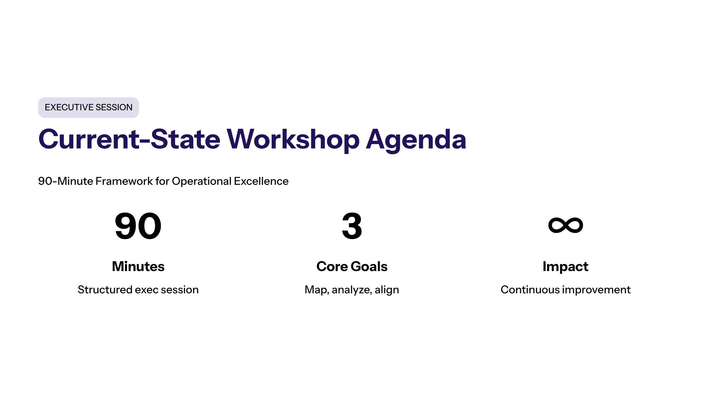A focused current state workshop agenda enables organizations to capture a detailed and accurate picture of existing processes, uncovering gaps and inefficiencies critical to operational excellence.