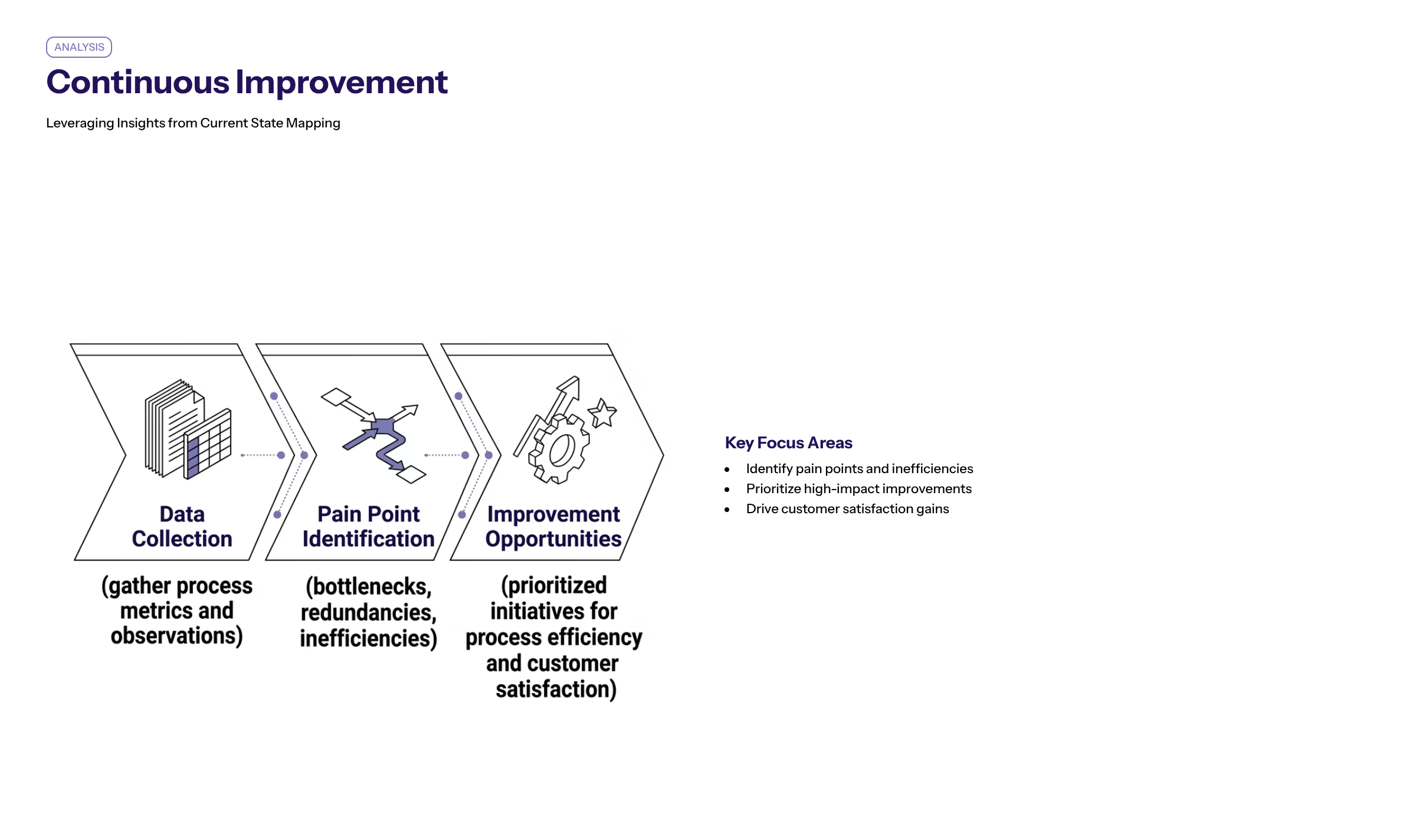Once the current state is mapped, the focus shifts to analyzing the data to identify potential areas ripe for improvement. This step is critical for driving continuous improvement initiatives that enhance process efficiency and customer satisfaction.