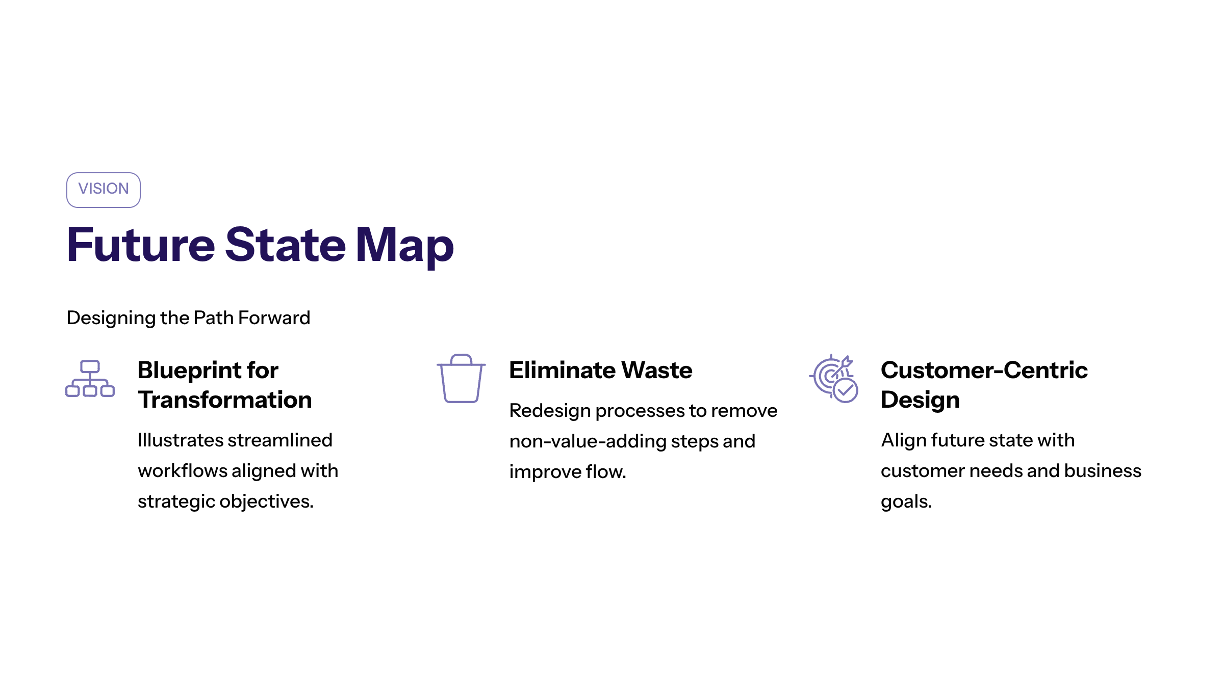 Building on insights from current state mapping, the future state map articulates an optimized vision of processes aligned with strategic objectives and customer needs.