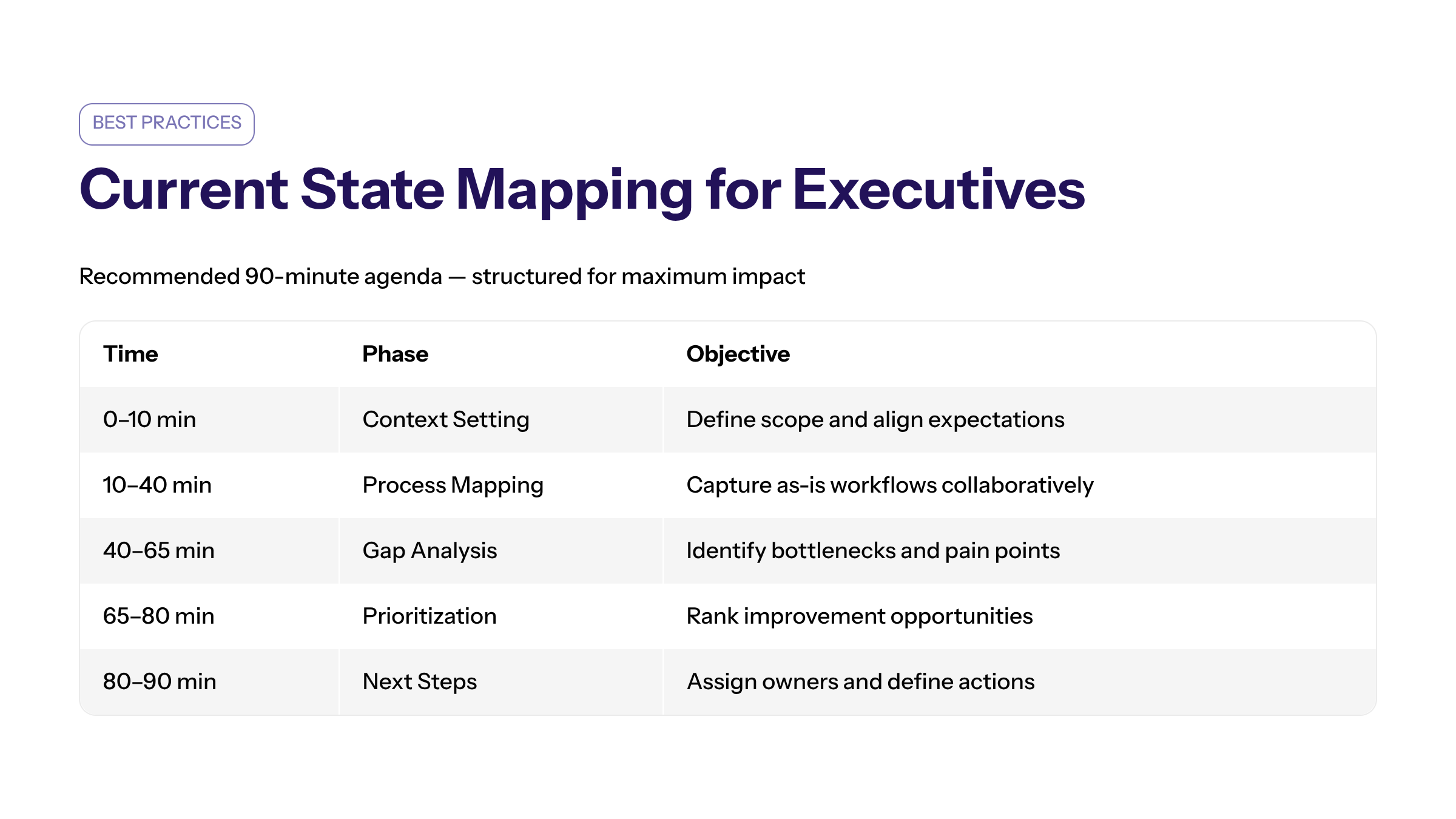 For executive audiences, time is limited, making a focused and structured agenda vital. The following table outlines a recommended 90-minute current state workshop agenda designed to maximize impact: