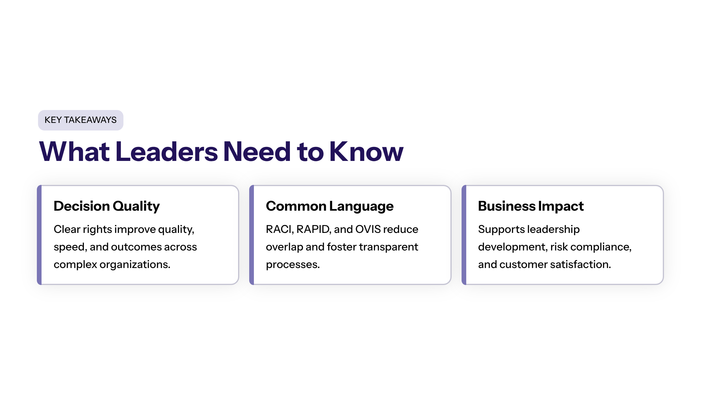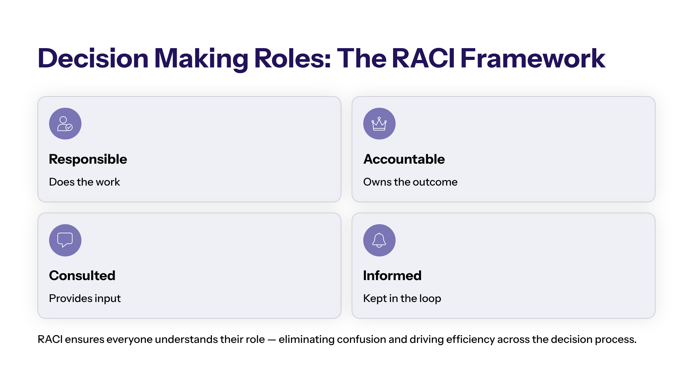 Frameworks like RACI, RAPID, and OVIS provide a common language to define responsibilities, reduce overlapping roles, and foster transparent decision making processes.
