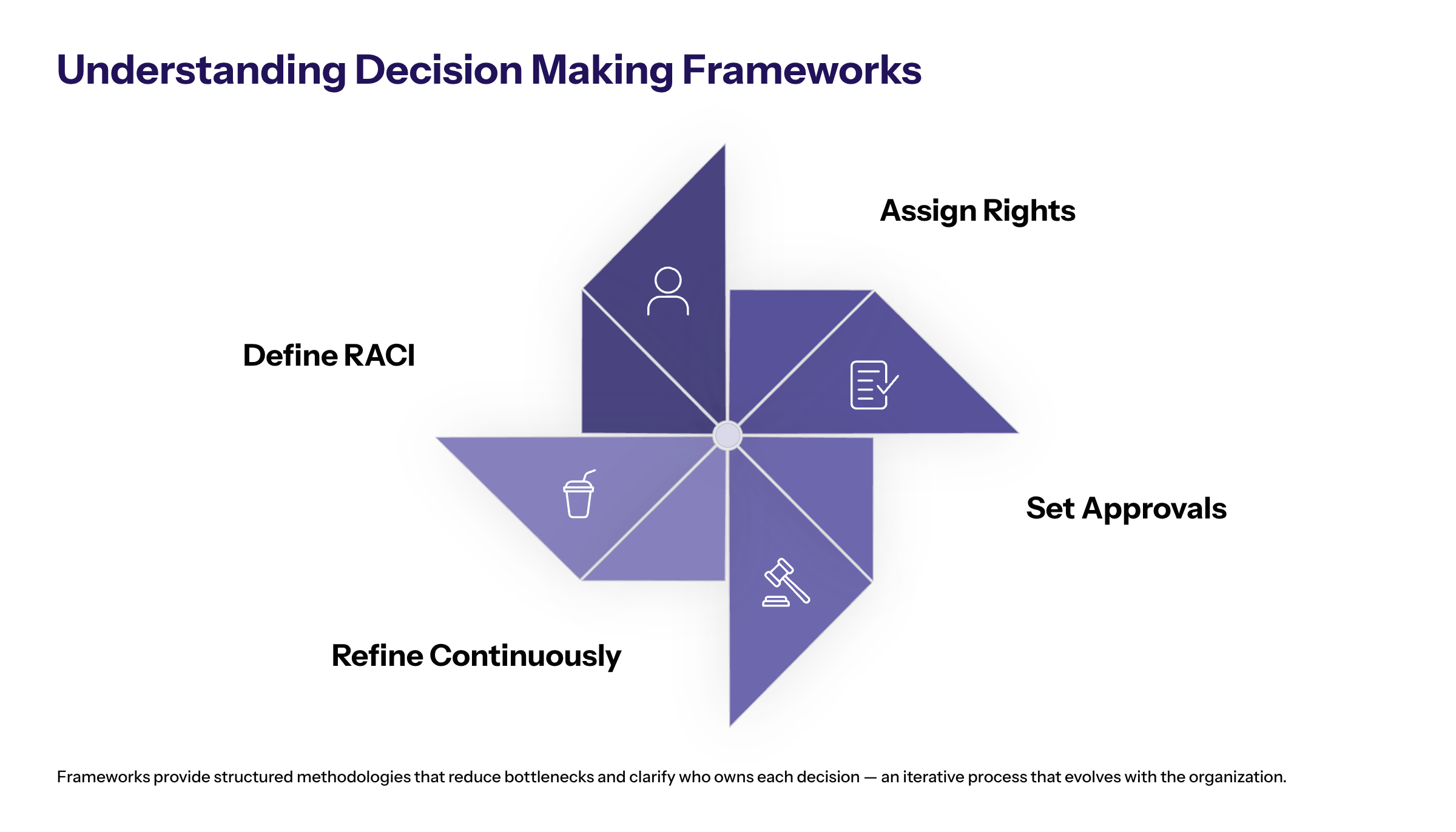 Decision making frameworks provide structured methodologies to guide organizations through complex choices. They help define who is responsible, accountable, consulted, and informed, ensuring clarity and reducing decision-making bottlenecks. The process of identifying decision makers in a Decision Rights Framework is iterative and generative, helping organizations continuously refine roles and responsibilities.