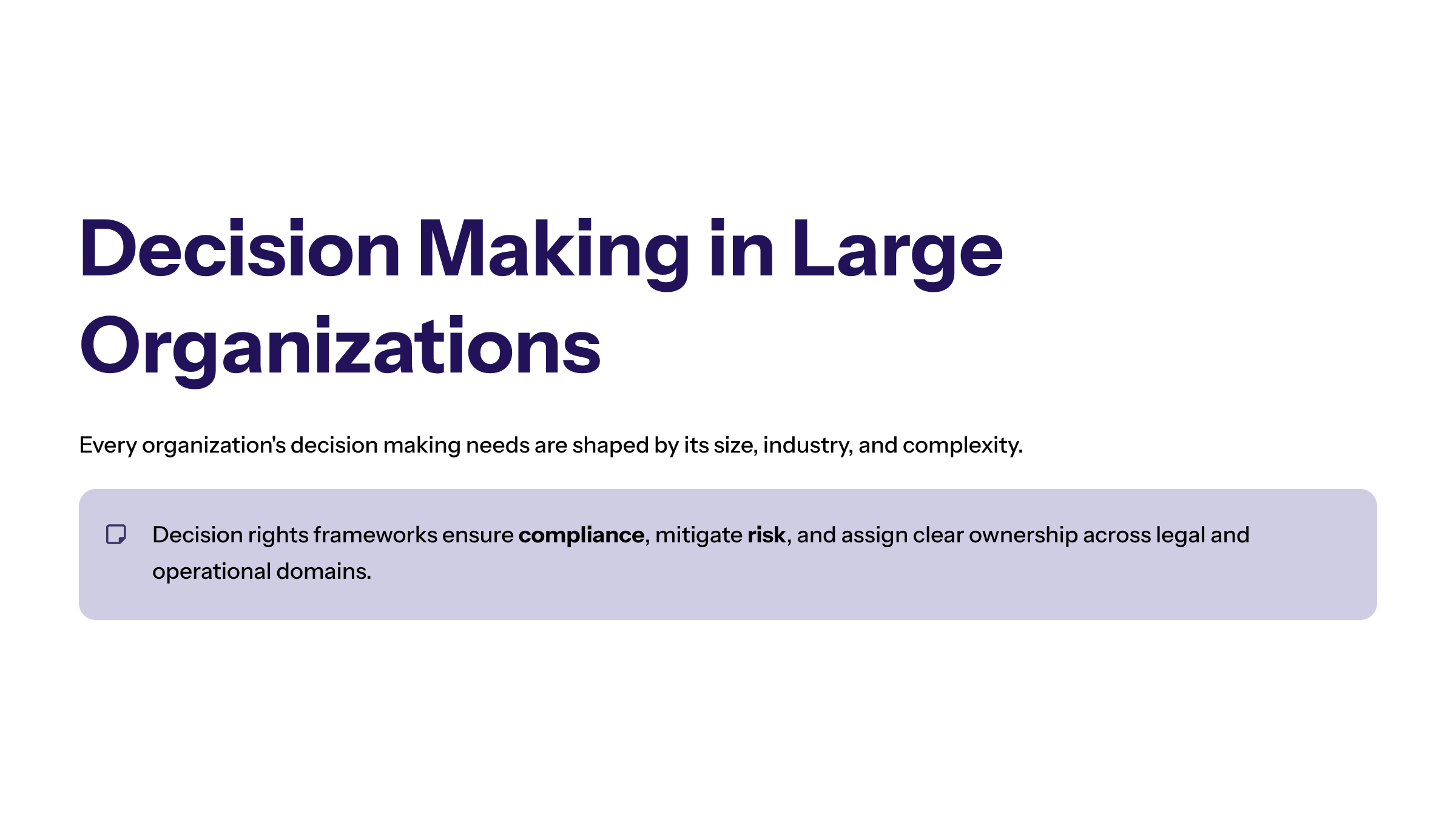Decision rights frameworks help organizations align decisions with strategic initiatives such as digital transformation, risk management, and regulatory compliance. This alignment ensures that decisions contribute directly to business success and customer satisfaction. Clear decision rights also help organizations comply with evolving regulations, including those related to AI integration and pay transparency.