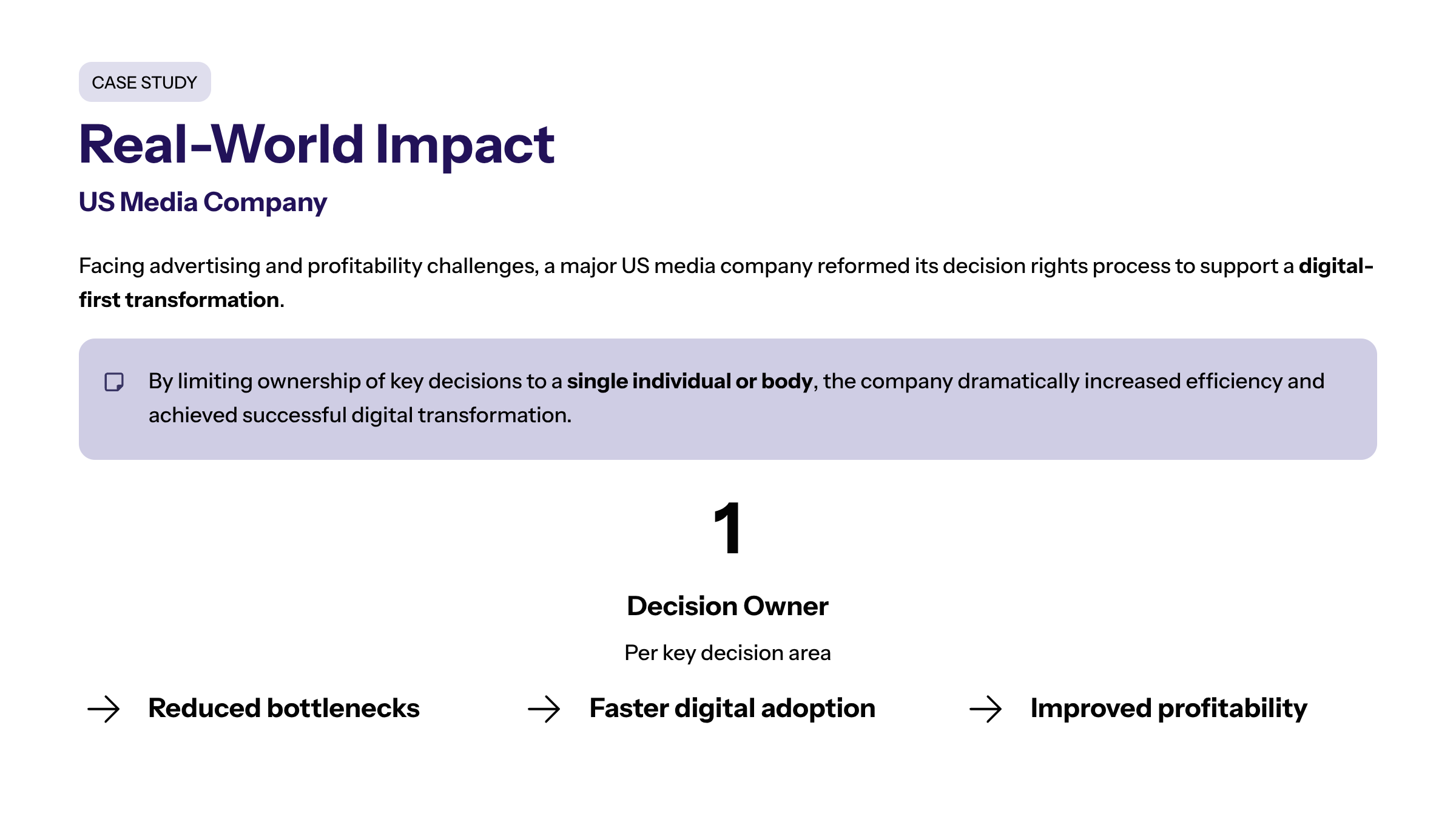 A major US media company reformed its decision rights process to support its transformation to a digital-first business model. Facing challenges related to advertising and profitability, the company limited ownership of key decisions to a single individual or body, dramatically increasing decision-making efficiency and enabling successful digital transformation.