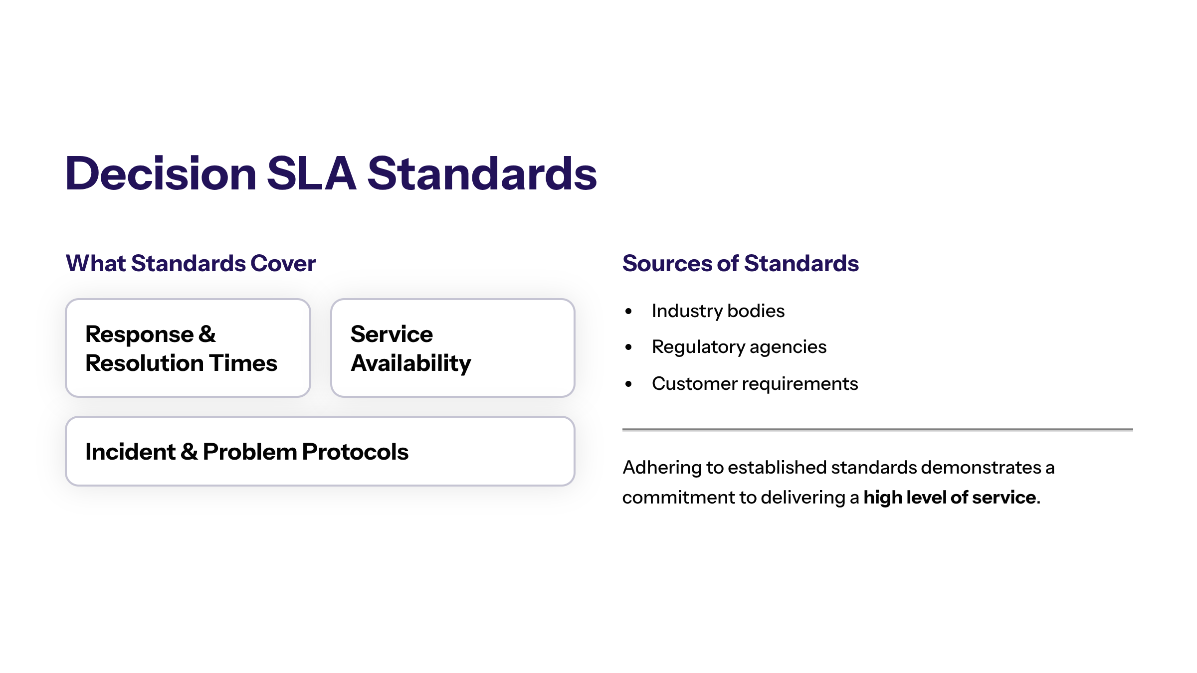 Decision SLA standards set the benchmark for service delivery, ensuring that the service provider consistently meets or exceeds minimum requirements. These standards typically include specific metrics for response times, resolution times, and service availability, as well as protocols for incident management and problem resolution.