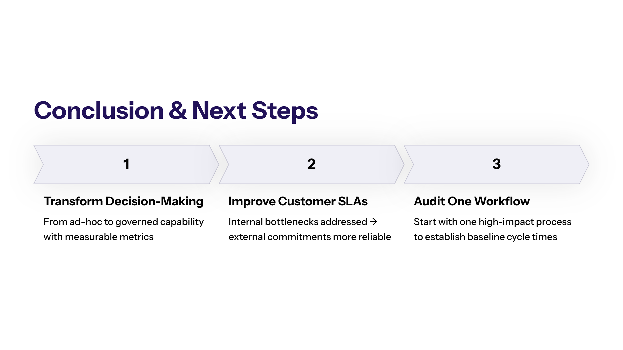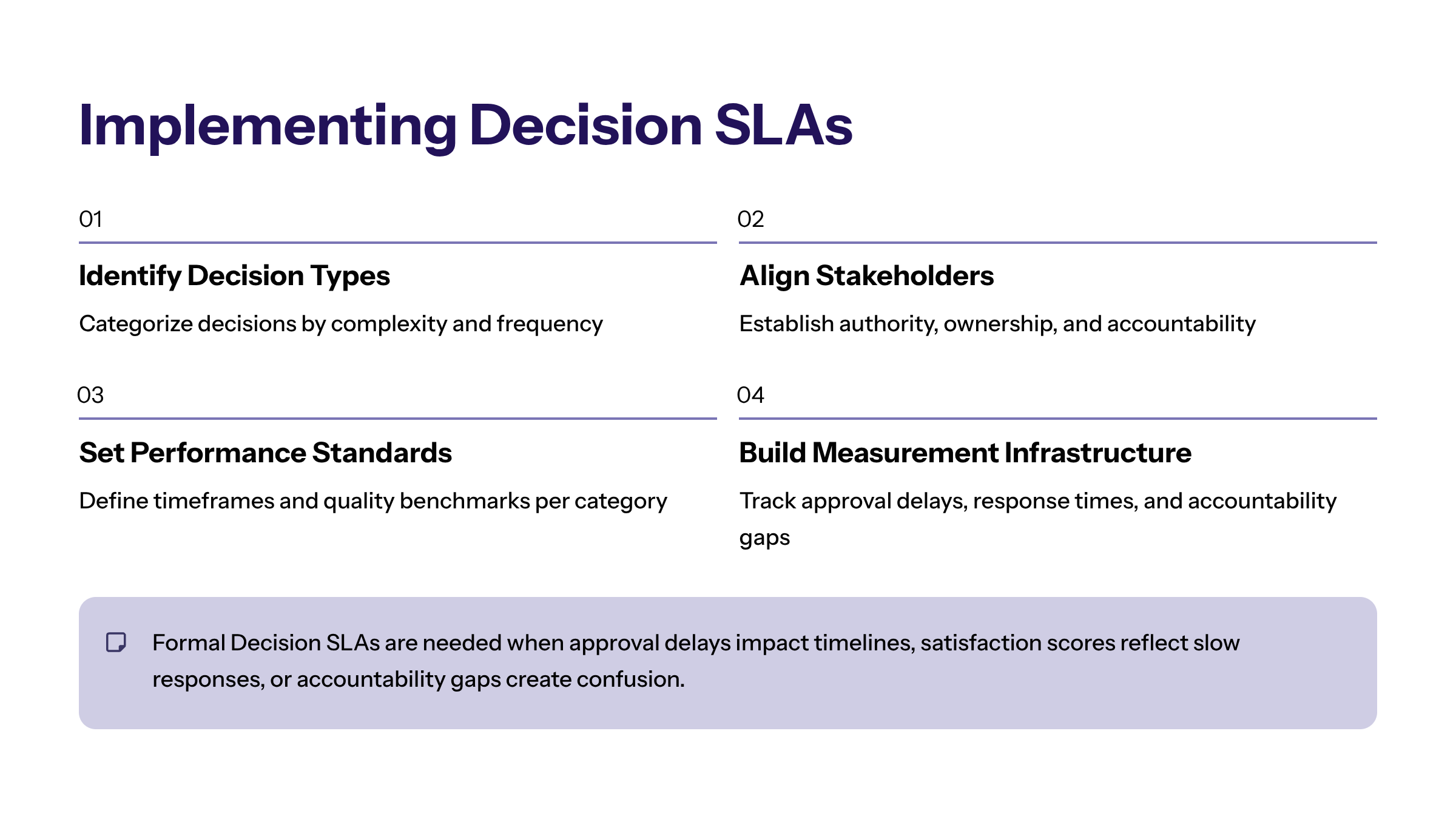 Decision SLAs transform organizational decision-making from an ad-hoc process into a governed capability with measurable metrics, clear accountability, and continuous improvement mechanisms. The impact extends beyond internal efficiency—customer level SLA commitments become more reliable when internal decision bottlenecks are systematically addressed.