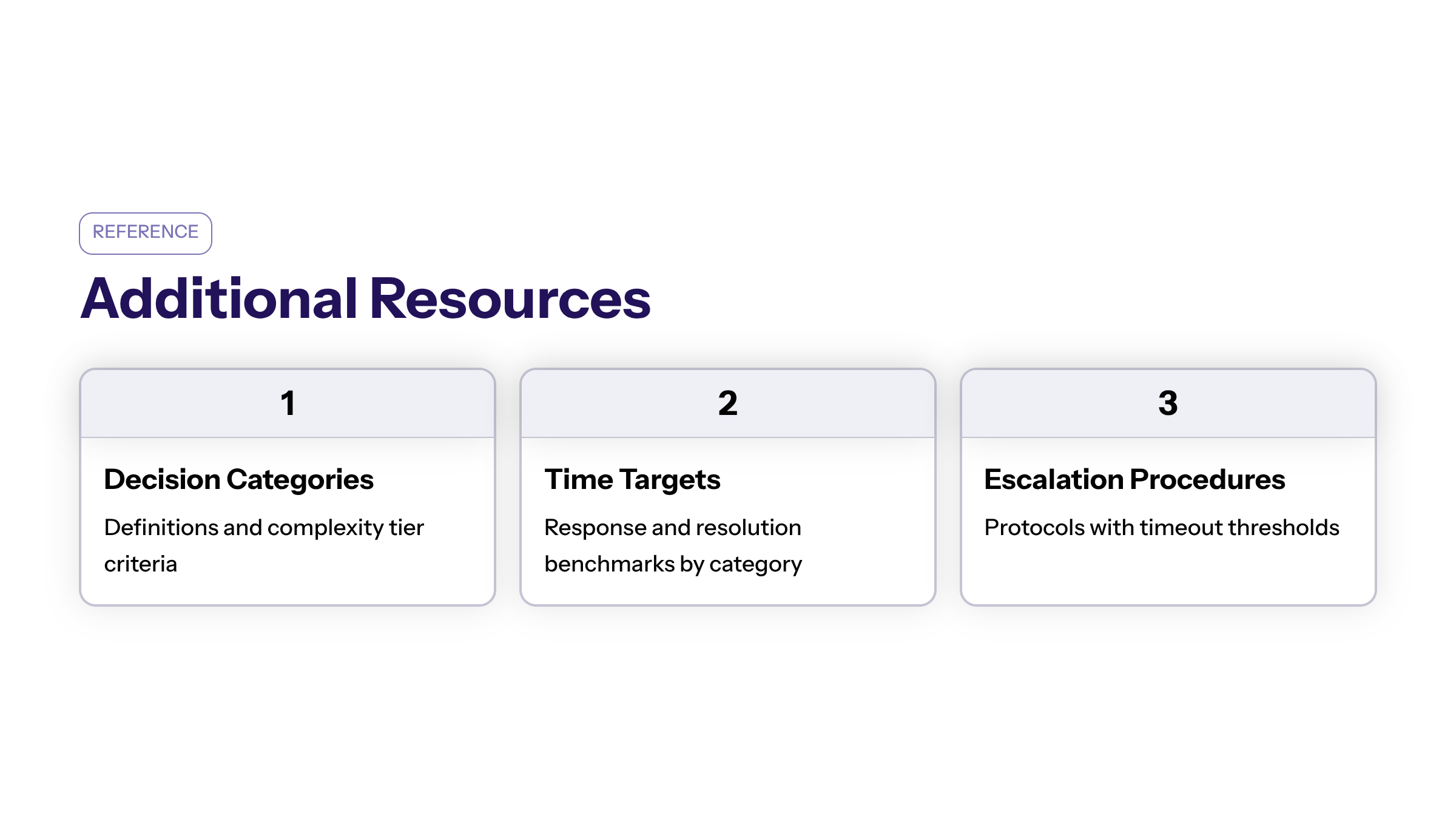 Set realistic timeframes based on decision complexity. Establish service level targets that balance business needs with decision maker capacity. A common SLA framework uses 4-hour/24-hour/72-hour tiers corresponding to complexity levels.