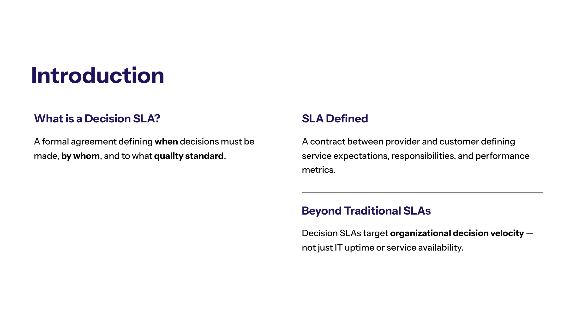 A decision SLA is a service level agreement that establishes specific timeframes, accountability measures, and quality standards for business decision-making processes. SLA stands for "service level agreement," which is a formal contract between a provider and a customer that defines service expectations, responsibilities, and performance metrics. Unlike traditional SLAs focused on IT services or service availability, decision SLAs address the often-overlooked bottleneck of organizational decision velocity—how quickly and effectively your business can make and communicate critical choices.
