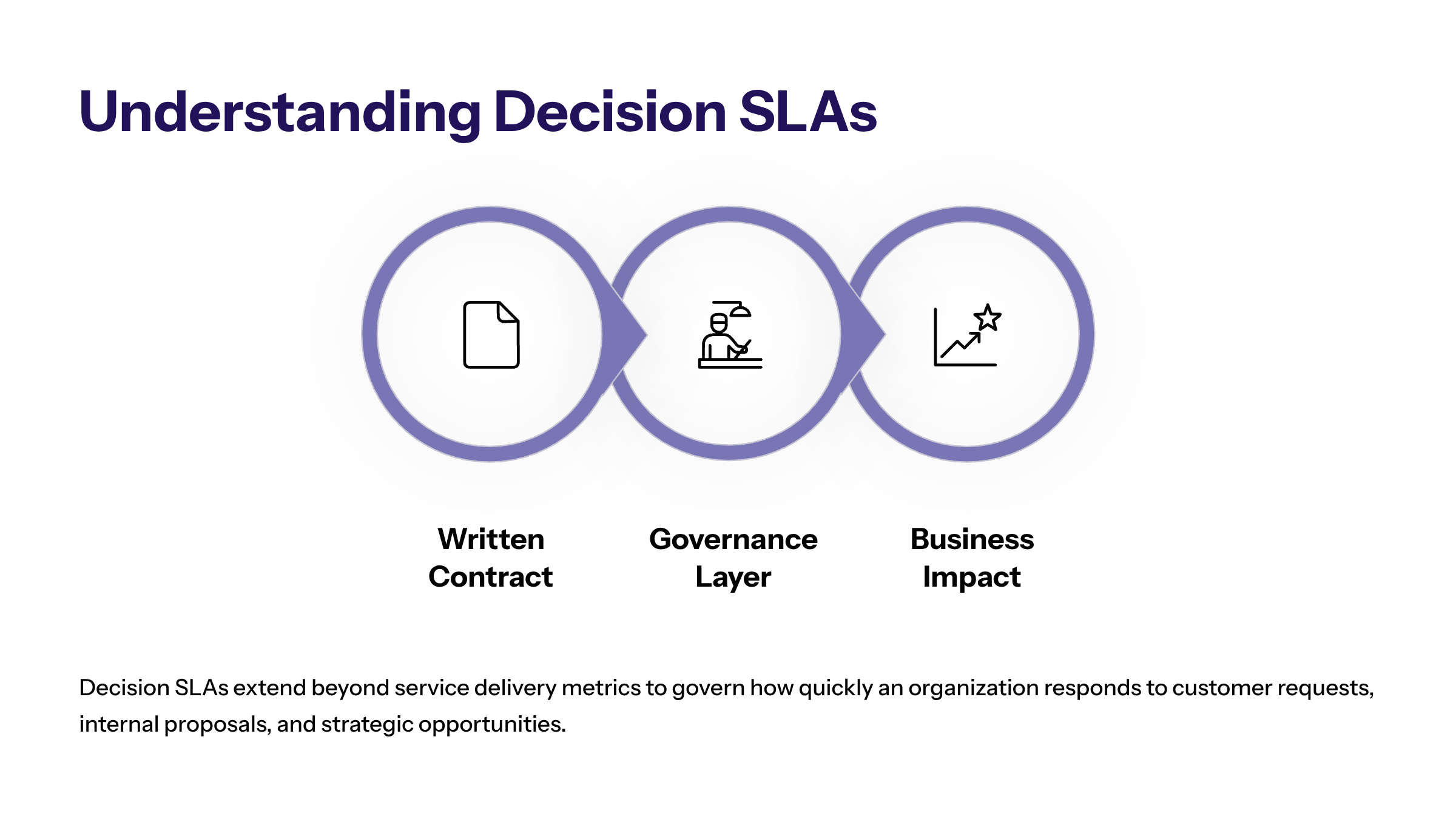 A decision SLA functions as a written contract—either formal or operational—that defines when decisions must be made, by whom, and to what quality standard. The SLA definition in this context extends beyond traditional service delivery metrics to encompass the governance layer that determines how quickly an organization can respond to customer requests, internal proposals, and strategic opportunities.