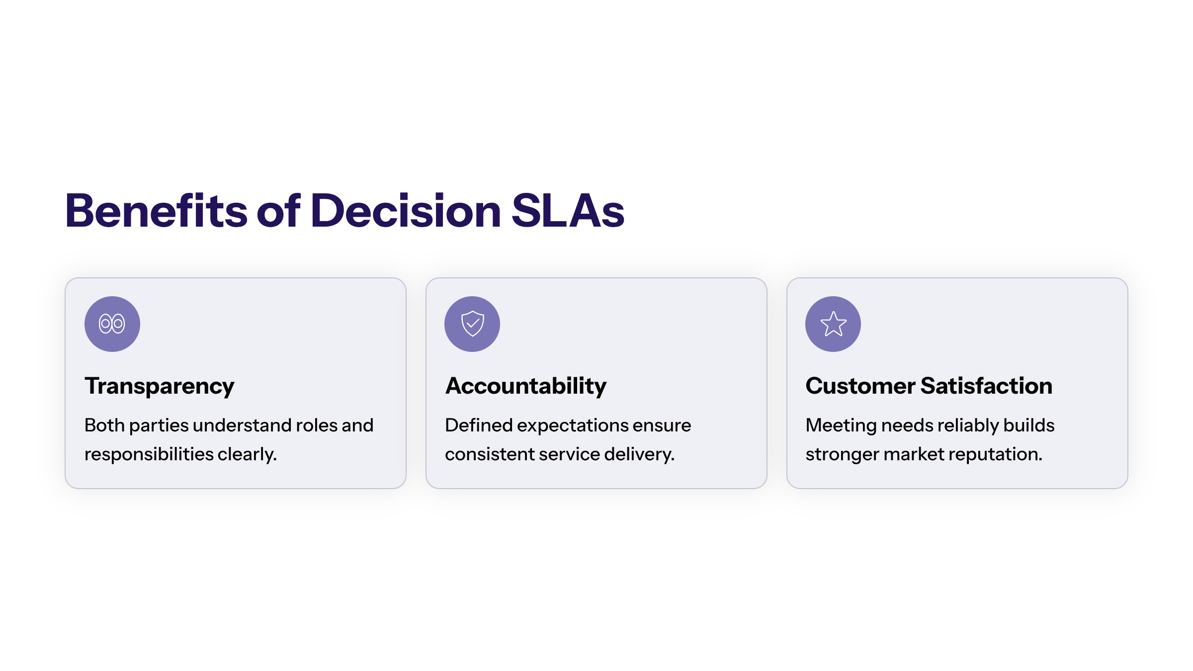 Implementing Decision SLAs brings significant advantages to both the service provider and the customer. By clearly defining service delivery expectations, these agreements foster transparency and accountability, ensuring that both parties understand their roles and responsibilities. This clarity helps the service provider consistently meet customer needs, leading to higher customer satisfaction and a stronger reputation in the market.