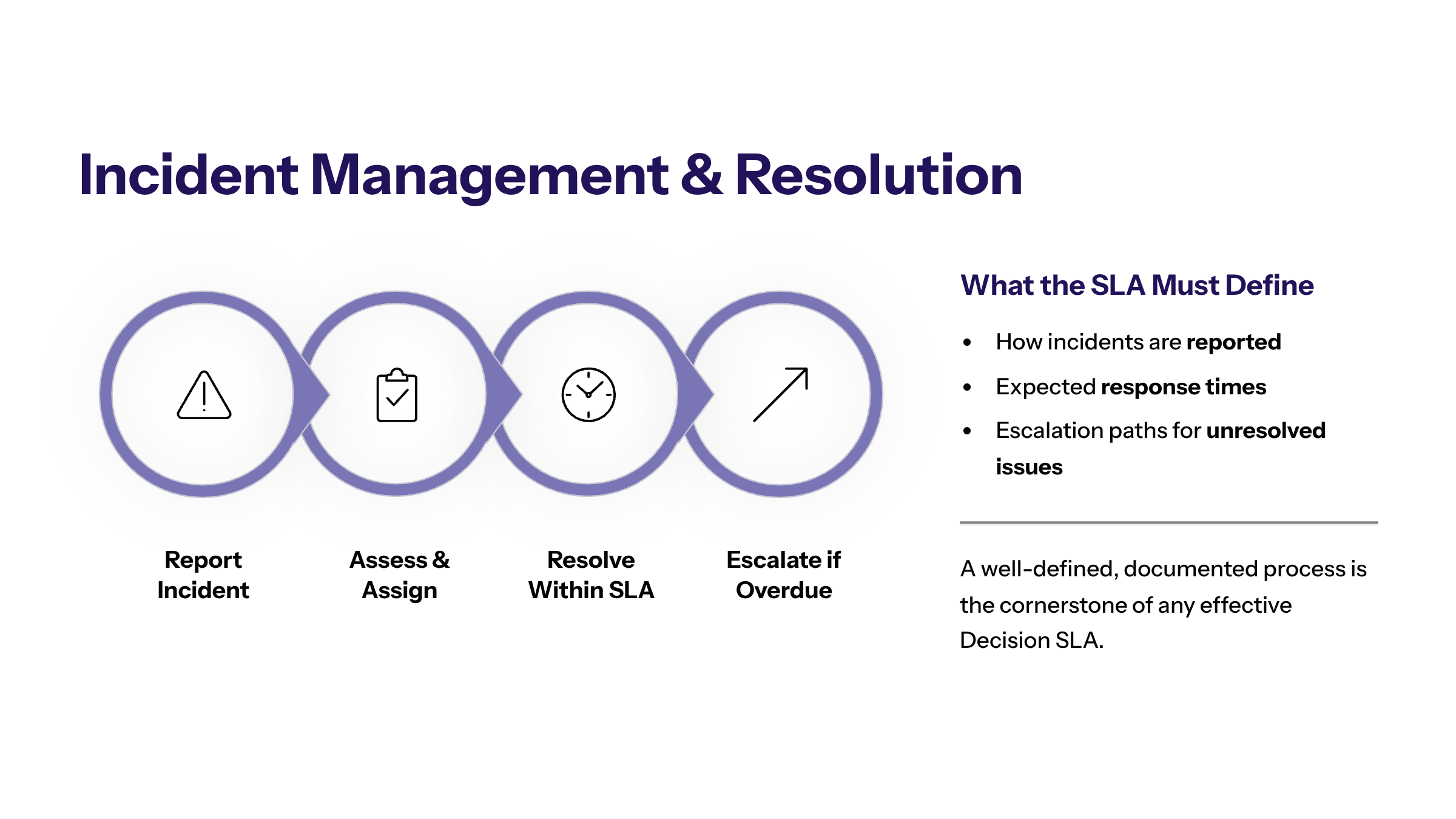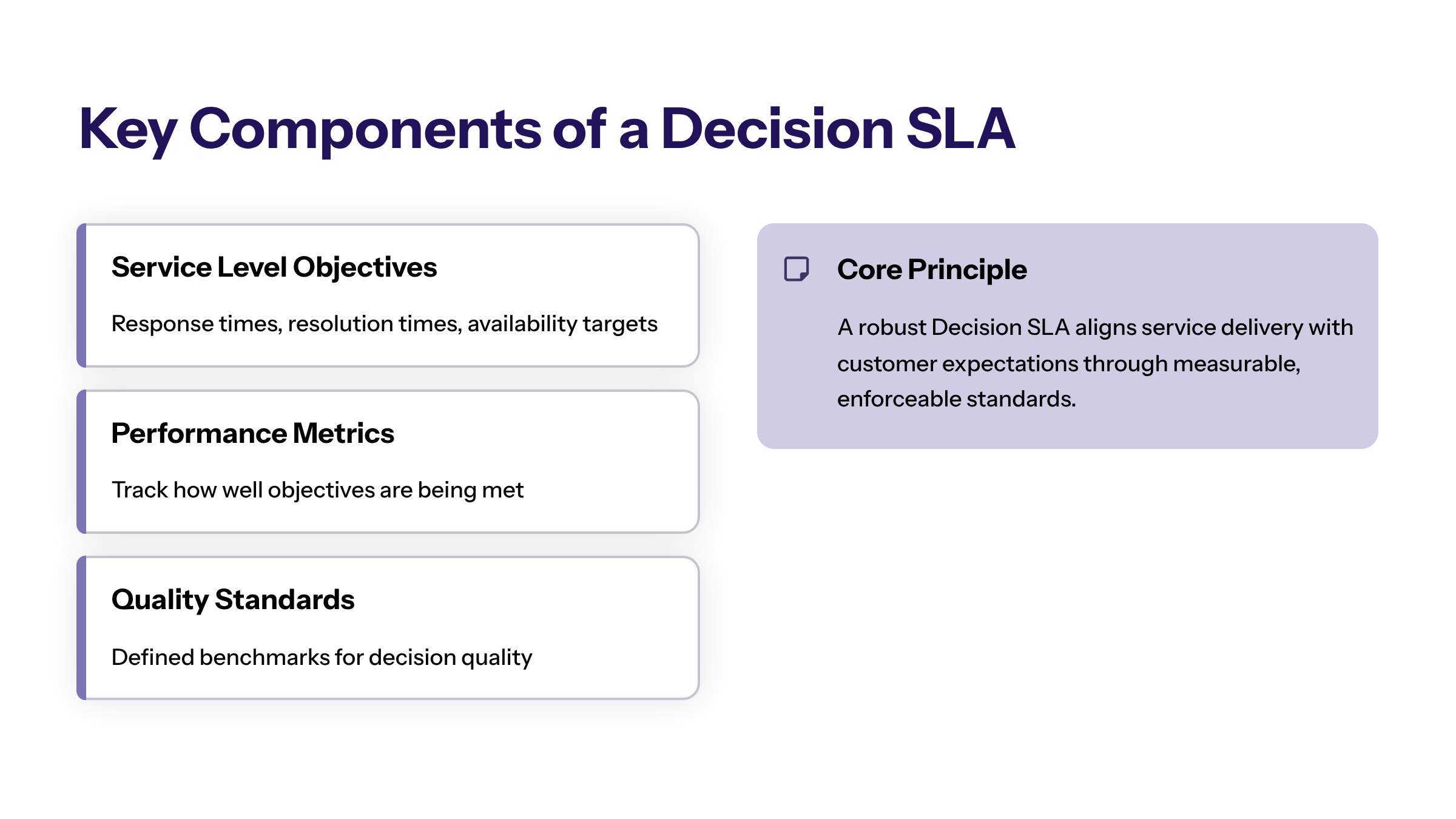 By incorporating these key components, a Decision SLA creates a comprehensive framework that supports consistent service delivery, meets customer expectations, and drives ongoing improvement in both performance and customer satisfaction.