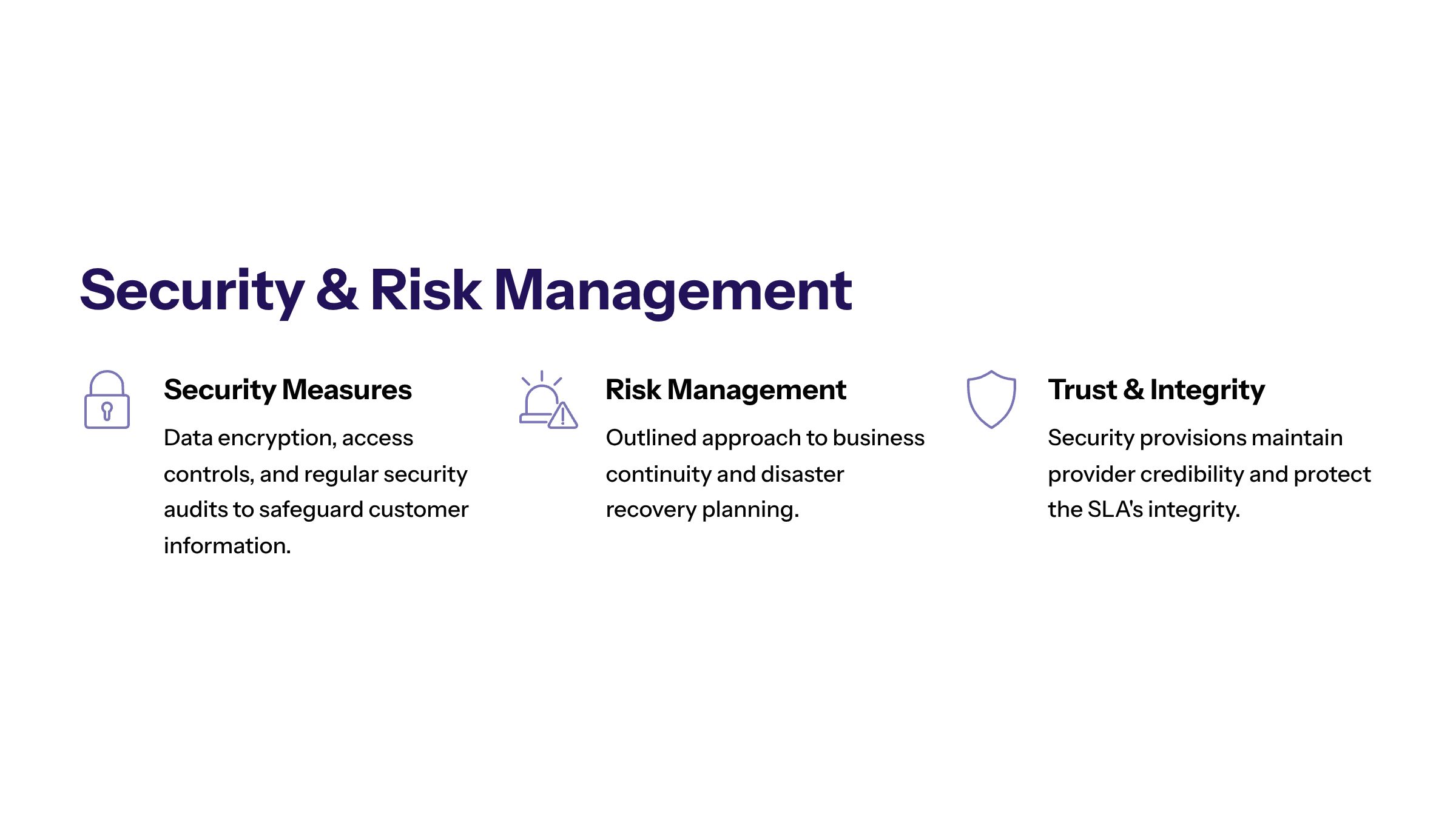 Security and risk management are vital to the integrity of Decision SLAs. The service provider must implement strong security measures—such as data encryption, access controls, and regular security audits—to safeguard customer information and maintain trust. The Decision SLA should also outline the provider’s approach to risk management, including business continuity and disaster recovery planning.