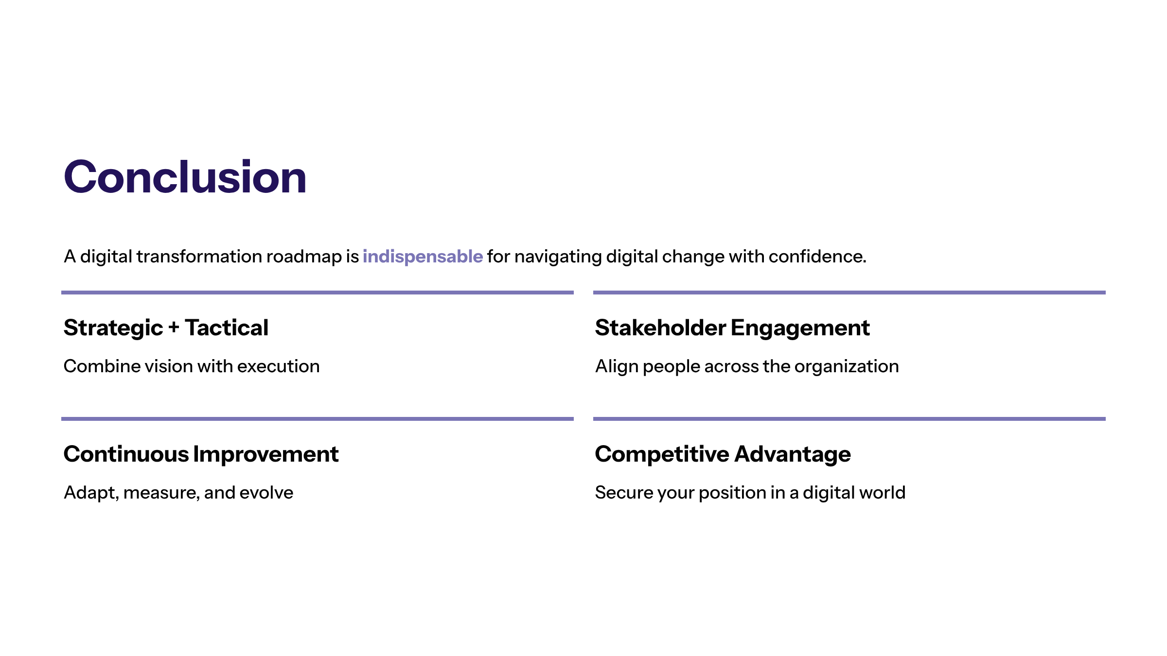 A digital transformation roadmap is indispensable for guiding organizations through the complexities of digital change. By combining strategic vision with tactical execution, engaging stakeholders, and adopting a continuous improvement mindset, organizations can achieve meaningful business outcomes, enhance customer experience, and secure competitive advantage in an increasingly digital world. The insights and frameworks discussed here provide executives with a practical, expert guide to crafting and implementing their digital transformation roadmap template for success.