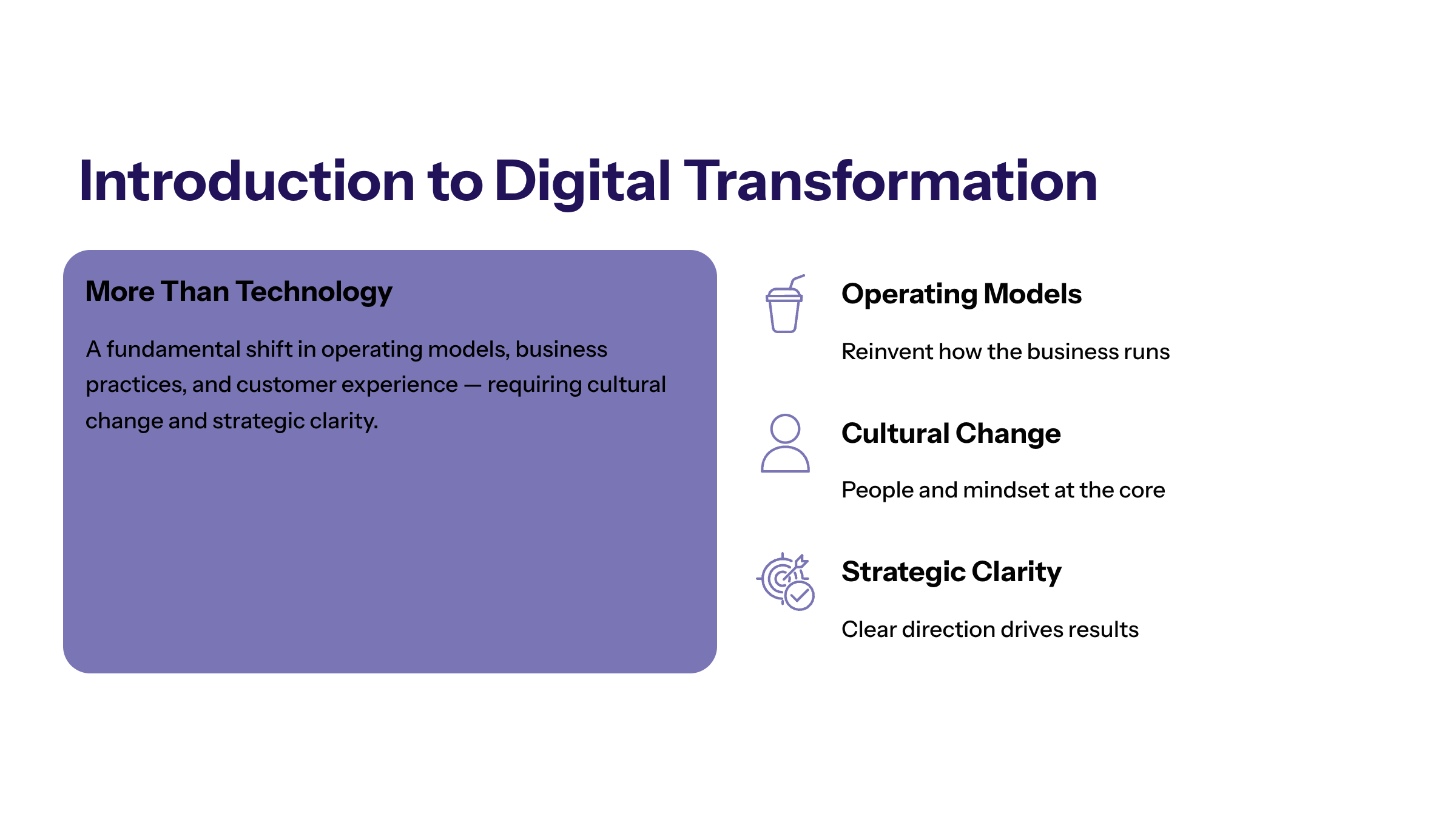 Digital transformation represents a fundamental shift in how organizations leverage digital technologies to transform their operating models, reinvent business models, optimize internal processes, and enhance customer experience. It involves more than just technology adoption; it requires cultural change, operational redesign, and strategic clarity.