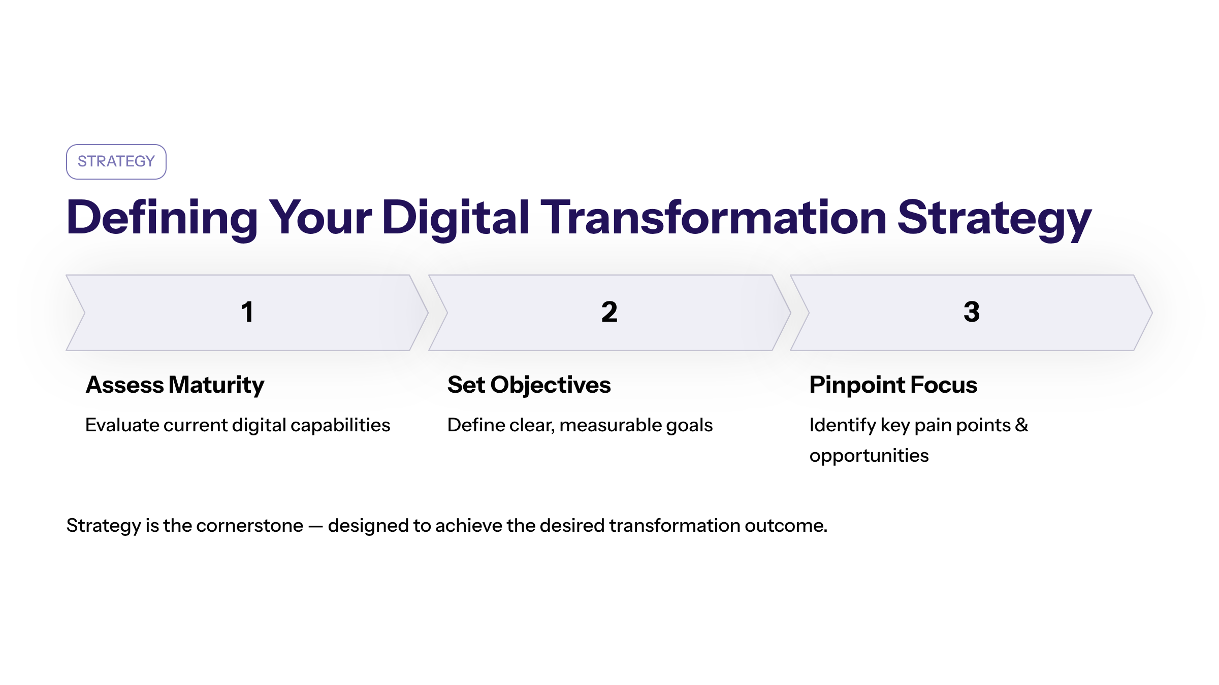 It involves assessing the current digital maturity of the organization, identifying strategic objectives, and pinpointing focus areas for improvement. Vision and strategic objectives must link digital goals to measurable business outcomes, such as a 15% reduction in operating costs.