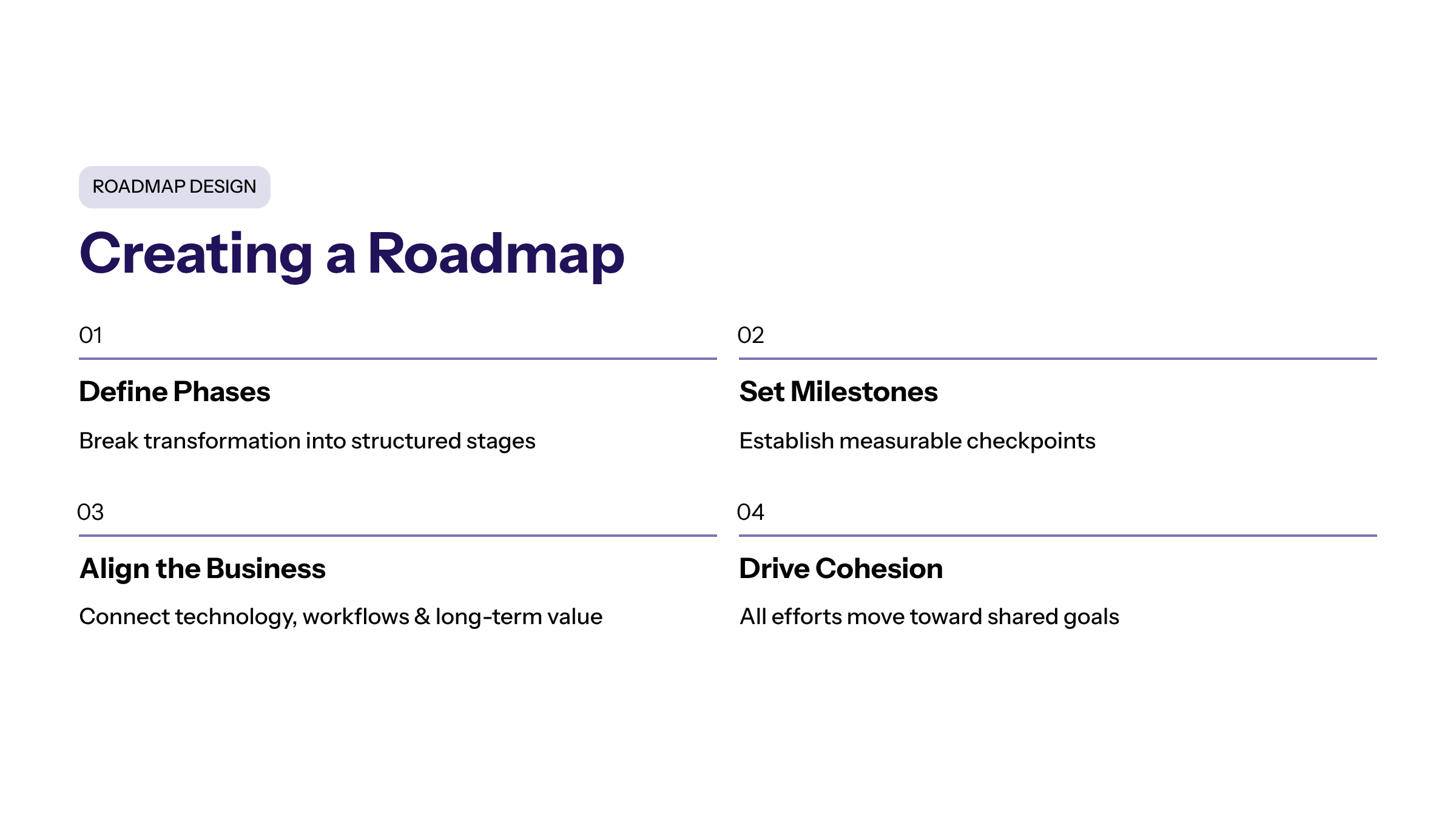 The roadmap should create alignment across the business by breaking down the transformation into defined phases, with clear objectives, responsible teams, and measurable outcomes.