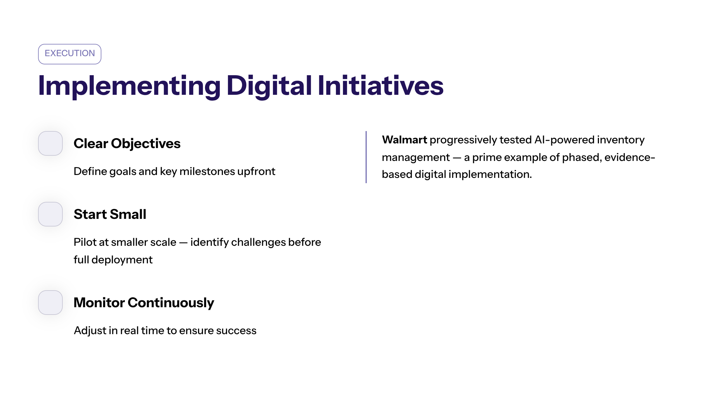Digital initiatives must be executed with clear objectives, key milestones, and continuous monitoring to ensure success.