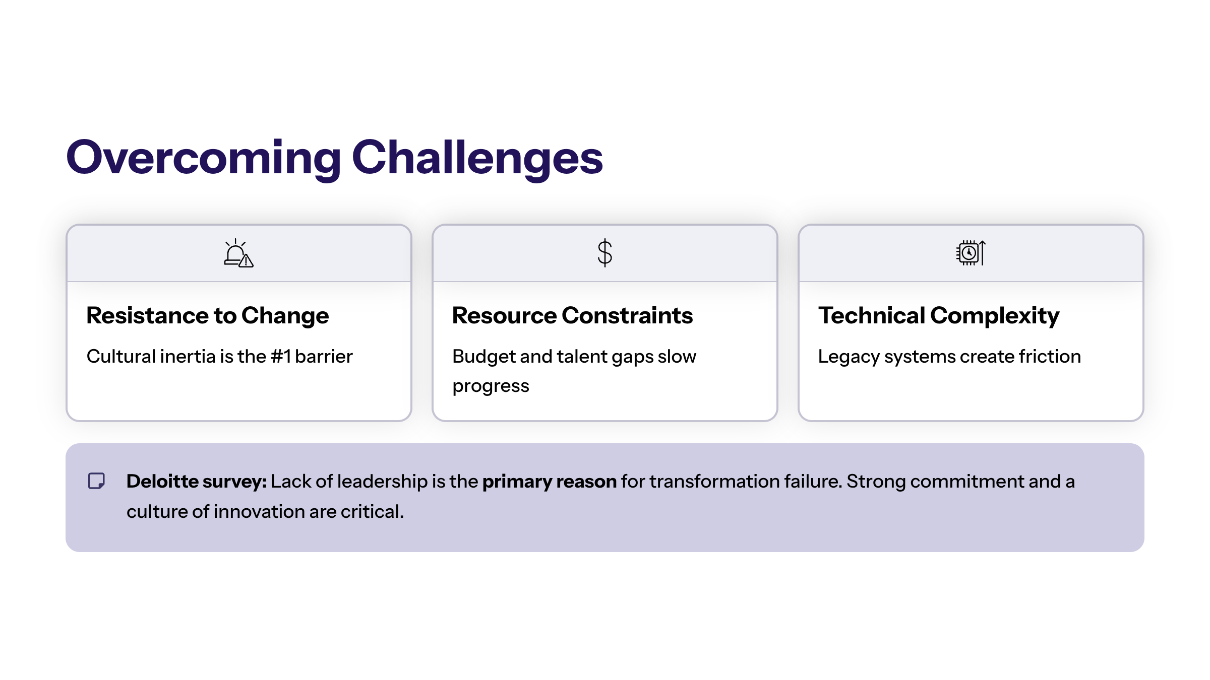 Strong leadership commitment and fostering a culture of innovation are critical success factors. According to a Deloitte survey, lack of leadership is a primary reason for transformation failure.