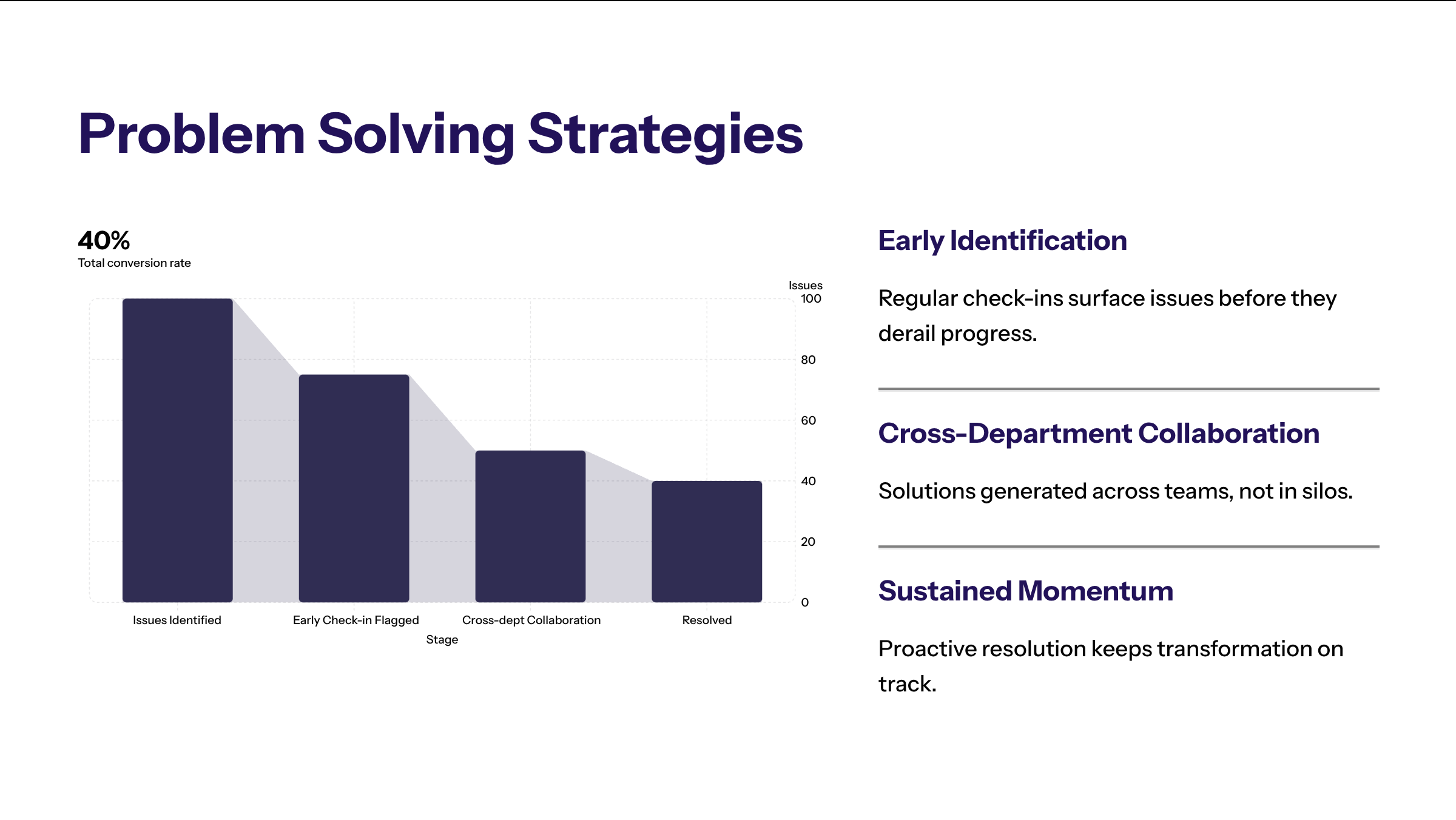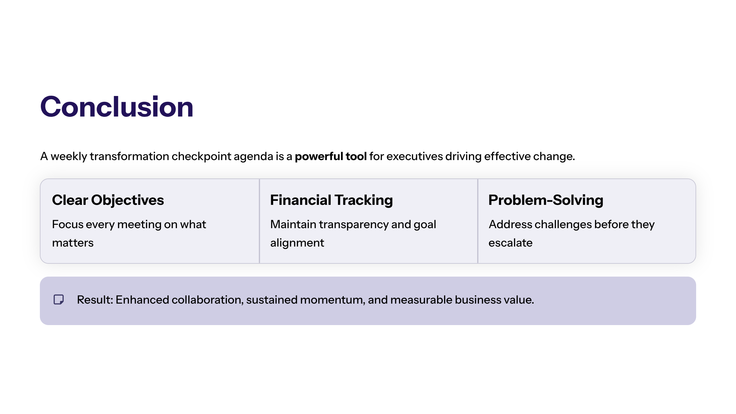 A weekly transformation checkpoint agenda is a powerful tool for executives and teams aiming to drive effective transformation. By combining clear objectives, financial tracking, and robust problem-solving strategies, organizations can enhance collaboration, maintain momentum, and achieve measurable results.