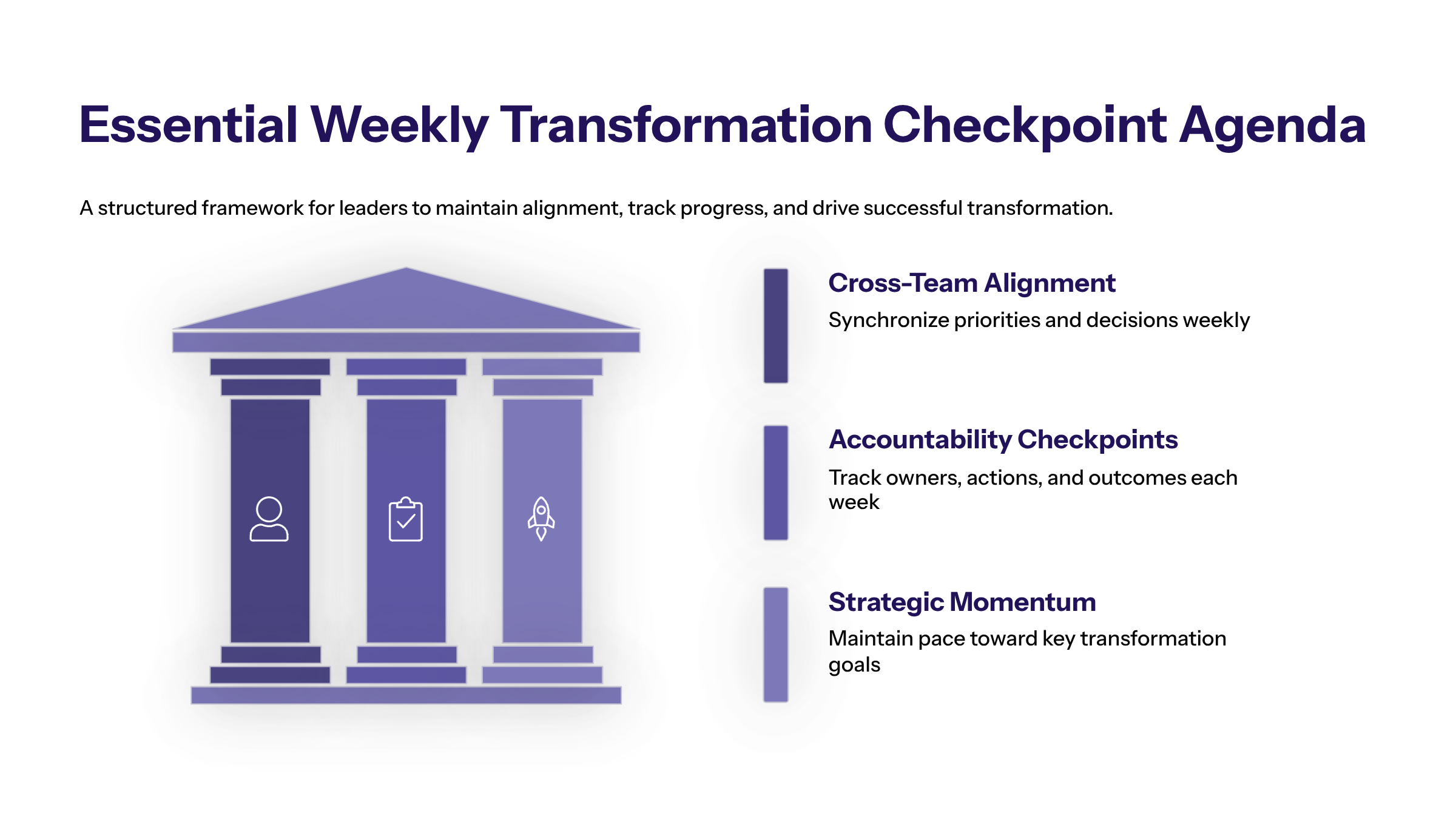 In 2026, weekly transformation checkpoint agendas focus on capacity over messaging, treating organizational change as a load-bearing system that must be measured and monitored in real-time.