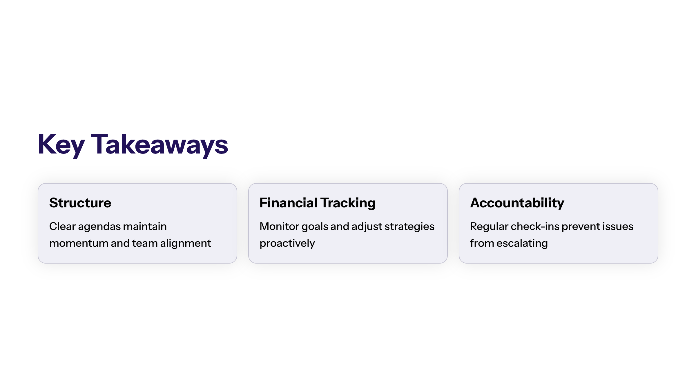Financial tracking and planning integrated into weekly meetings enable teams, such as sales and operations, to monitor progress toward financial goals and adjust strategies proactively.