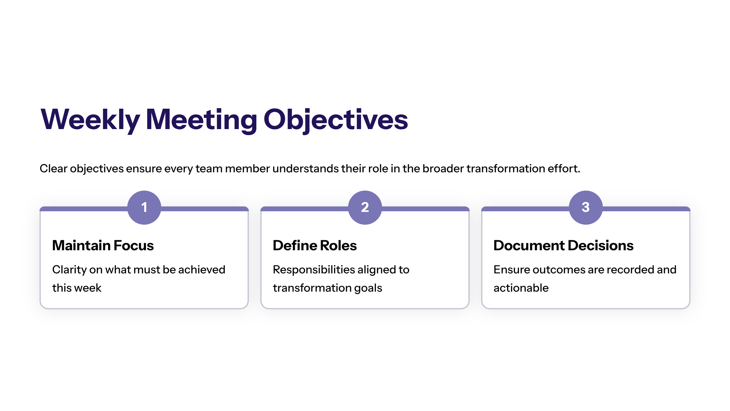 This article provides a comprehensive analysis of how structured weekly meetings can enhance productivity, support decision-making, and drive successful transformation initiatives.