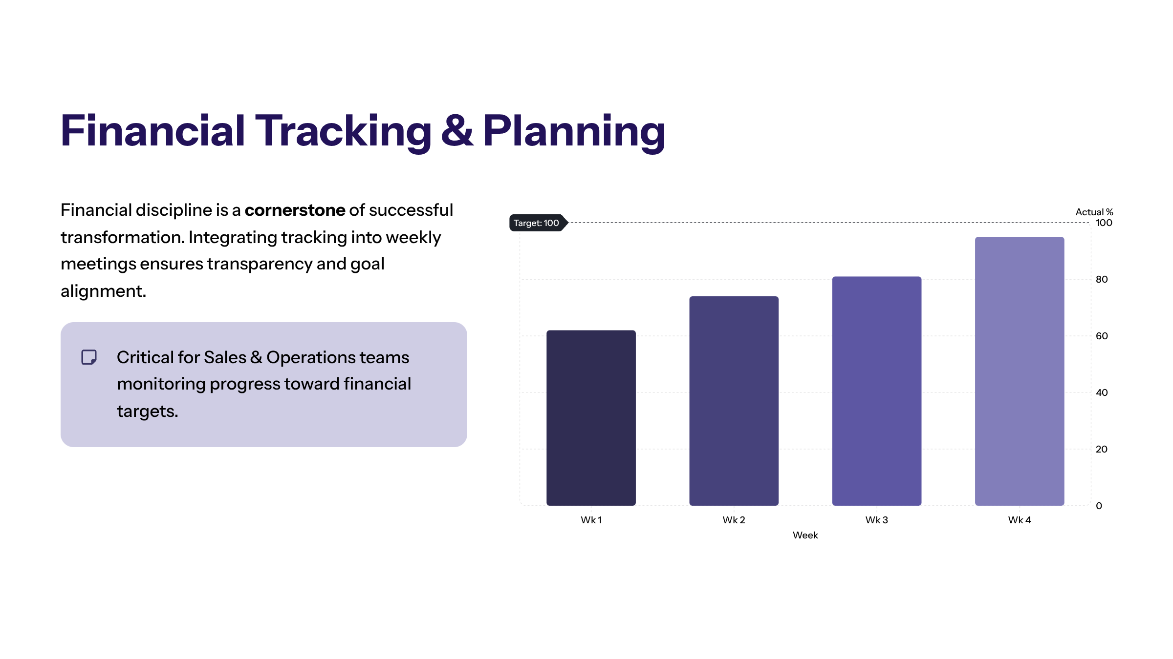 Financial discipline is a cornerstone of successful transformation programs. Integrating financial tracking into weekly meetings ensures transparency and alignment with organizational goals.