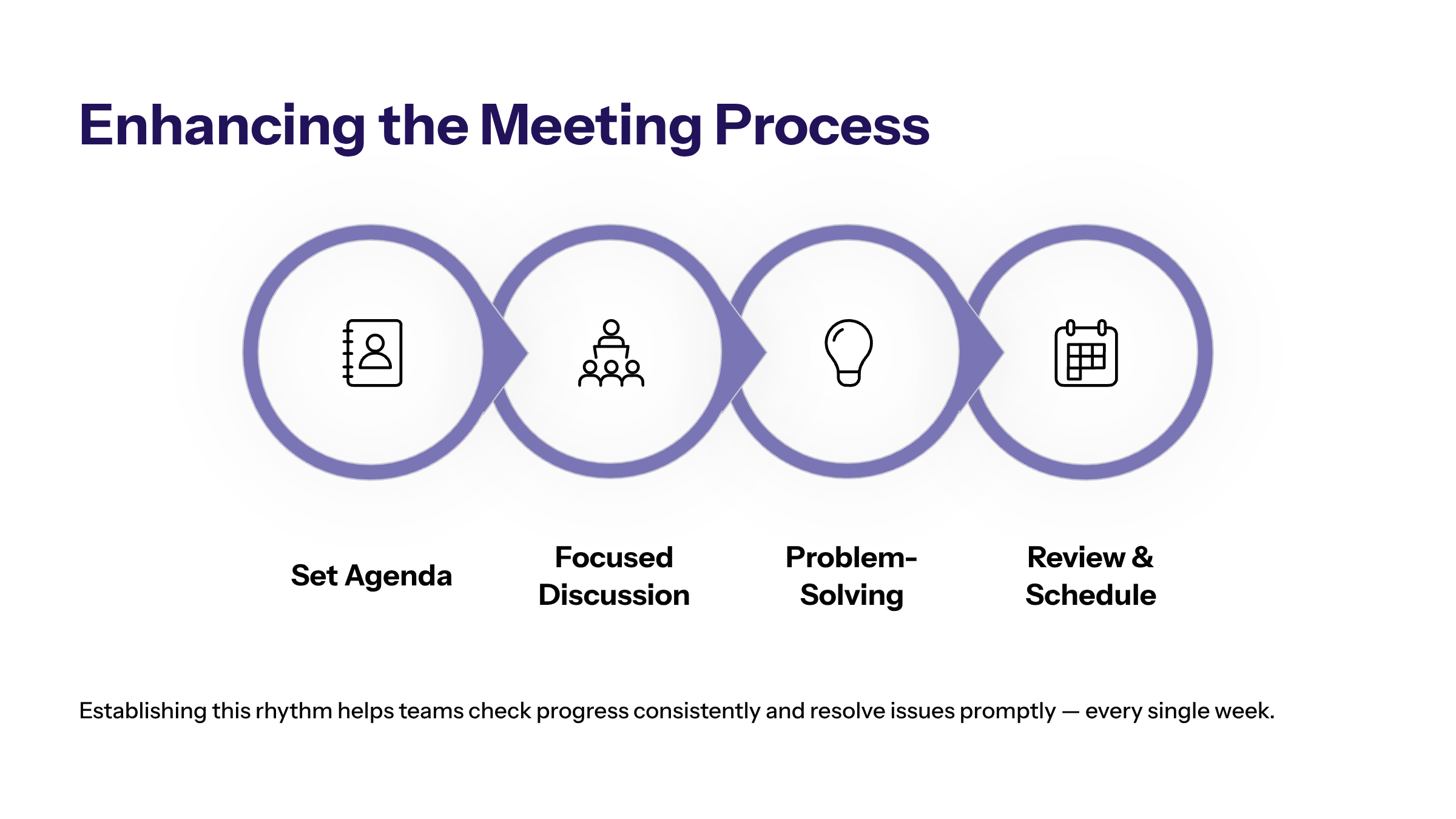 Structured weekly meetings with clear agendas and checkpoints are essential for maintaining momentum and ensuring alignment across teams and departments.