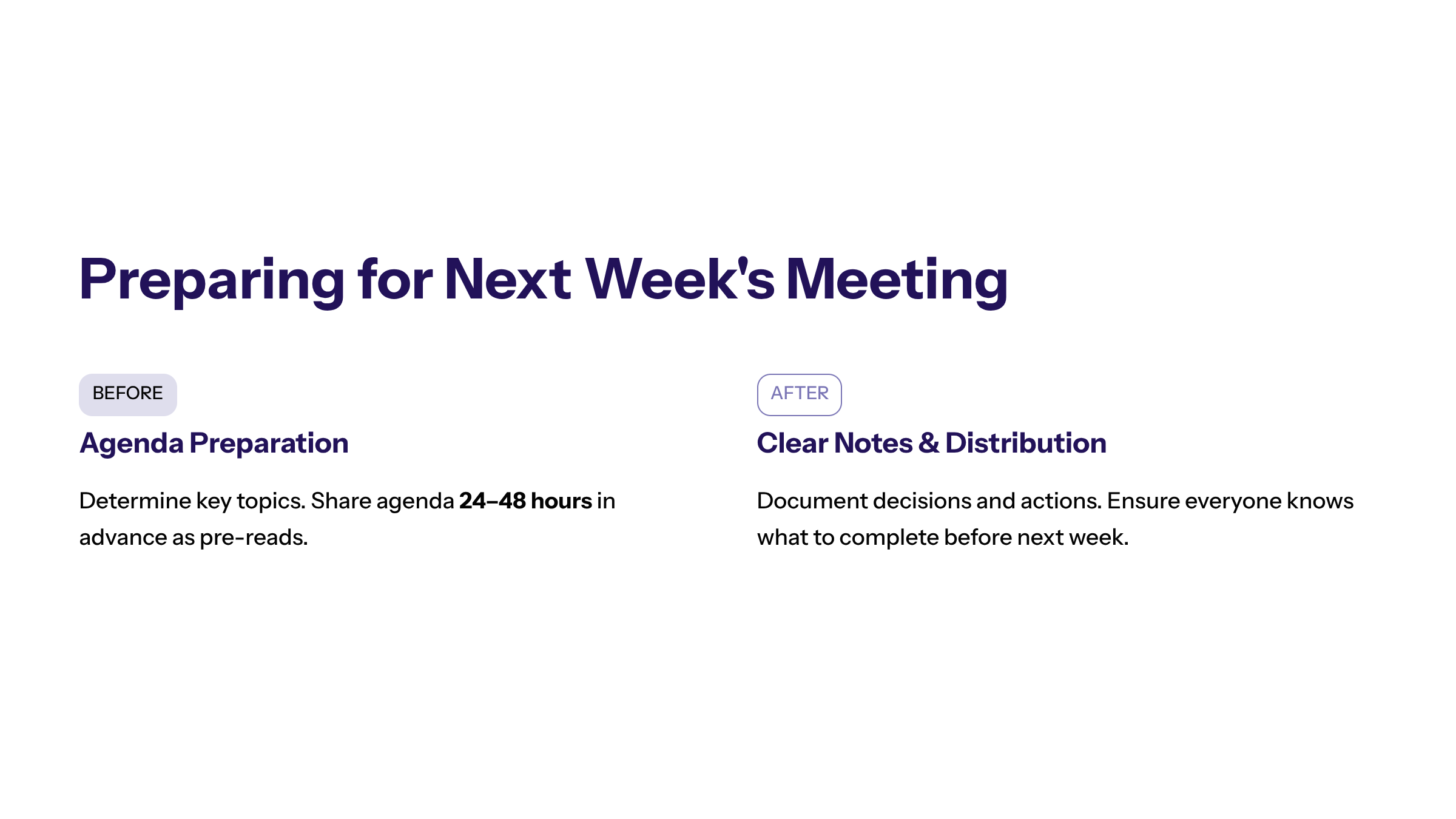Effective weekly meetings depend on thoughtful preparation and writing of the agenda and minutes. Before the meeting, leaders should determine the key topics to cover and share the agenda with participants at least 24–48 hours in advance as pre-reads to give them time to prepare.