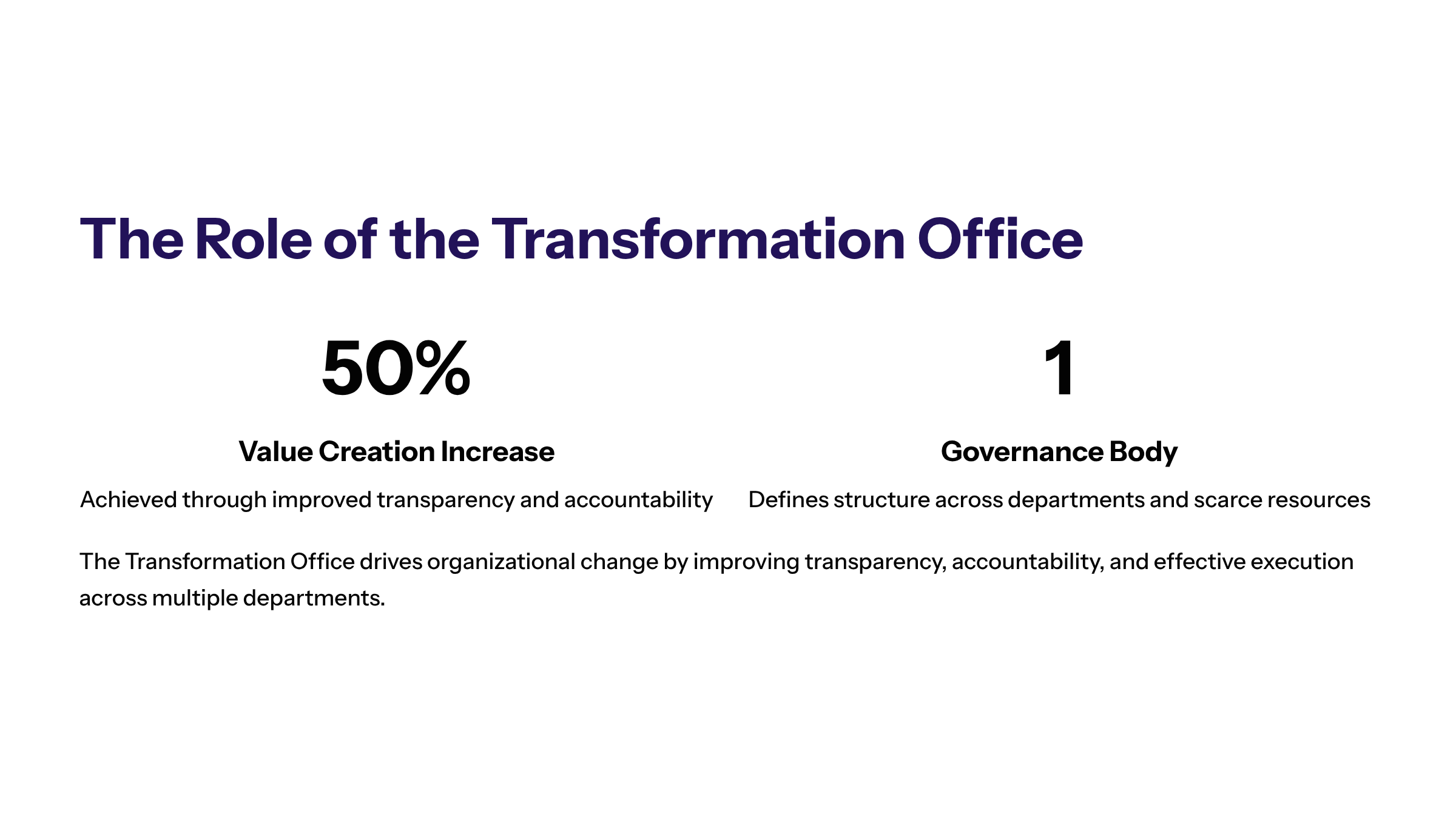 A transformation office (TO) can improve value creation by up to 50%, speeding value delivery while improving transparency and accountability.
