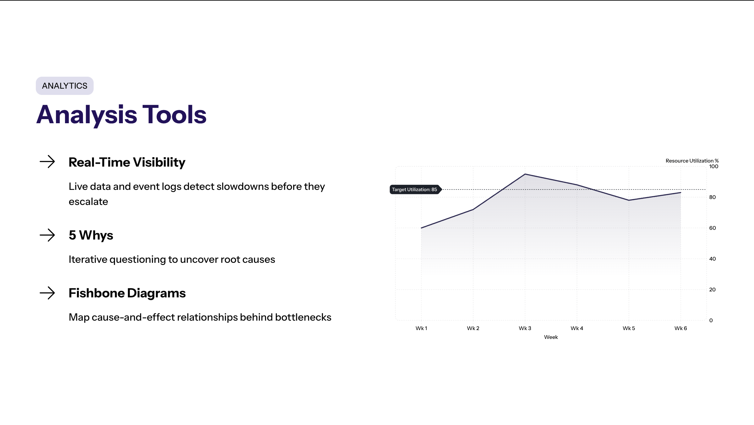 Analytics tools integrated with live data and event logs provide real-time visibility into the production process, allowing teams to detect slowdowns before they escalate. Techniques like the 5 Whys and Fishbone diagrams help uncover root causes behind bottlenecks, supporting data-driven decision-making.