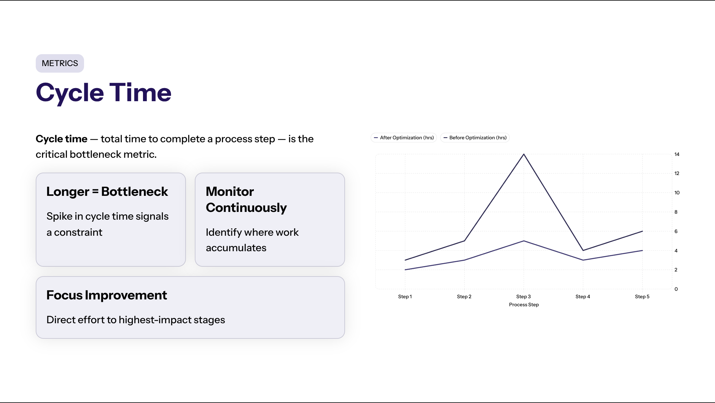 Reducing cycle time through workflow redesign, automation, or resource reallocation contributes to smoother operations and better throughput across the entire operation.