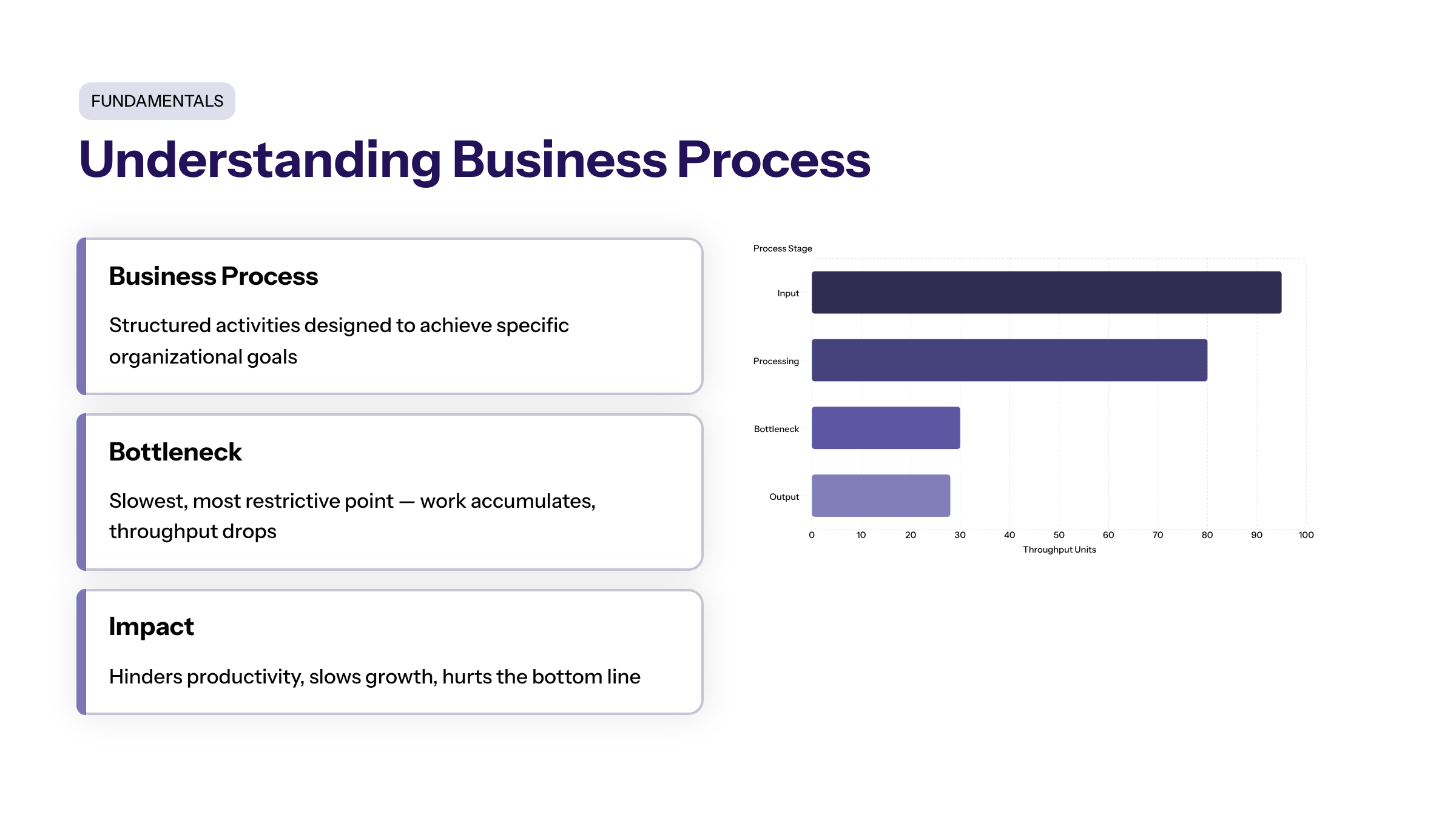 A business process is a structured set of activities designed to achieve specific organizational goals. Within these processes, bottlenecks represent the slowest points where work accumulates, limiting overall throughput and efficiency. Bottlenecks are the slowest or most restrictive parts of a system, process, or workflow that hinder productivity, slow growth, and negatively impact the bottom line.