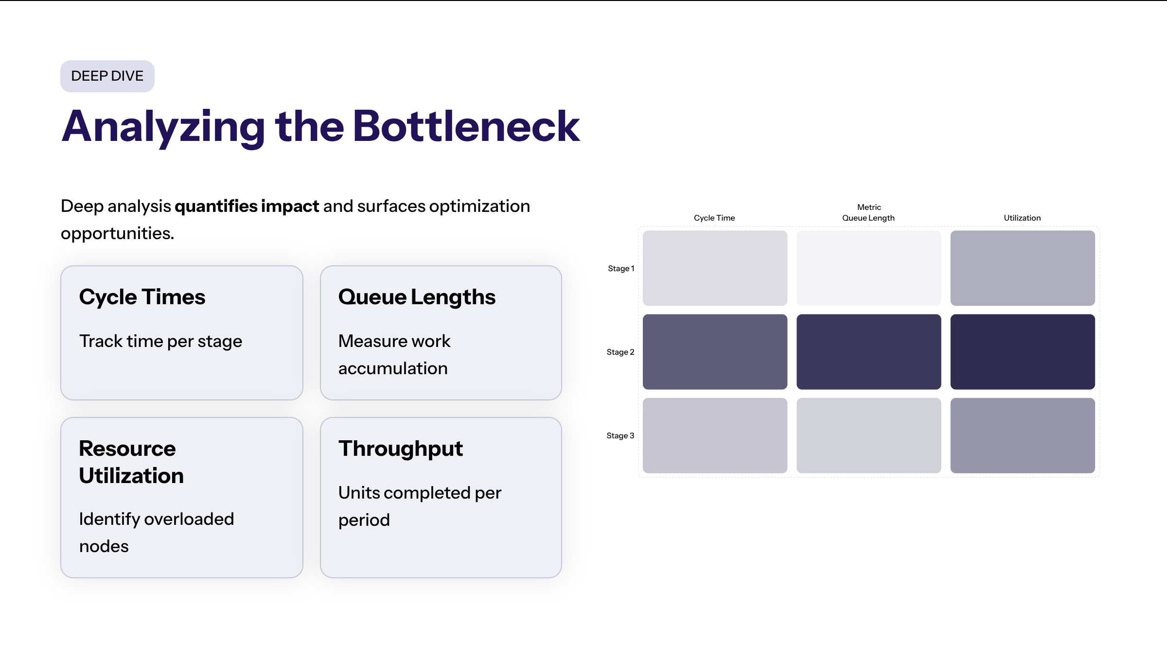 Cycle Time Heatmaps | Measures time to complete tasks in each stage | Pinpointing stages with longest delays |