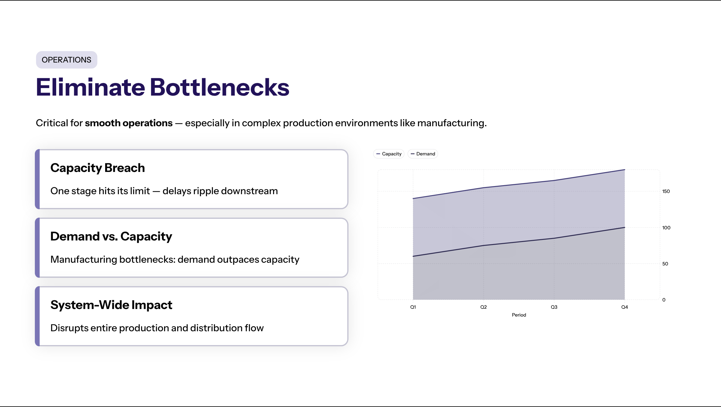 Invest in modern, scalable systems and hardware that can handle increased reporting demands and facilitate real-time visibility. Investing in additional capacity, such as upgrading machinery or adding parallel equipment, may be necessary to resolve persistent bottlenecks.